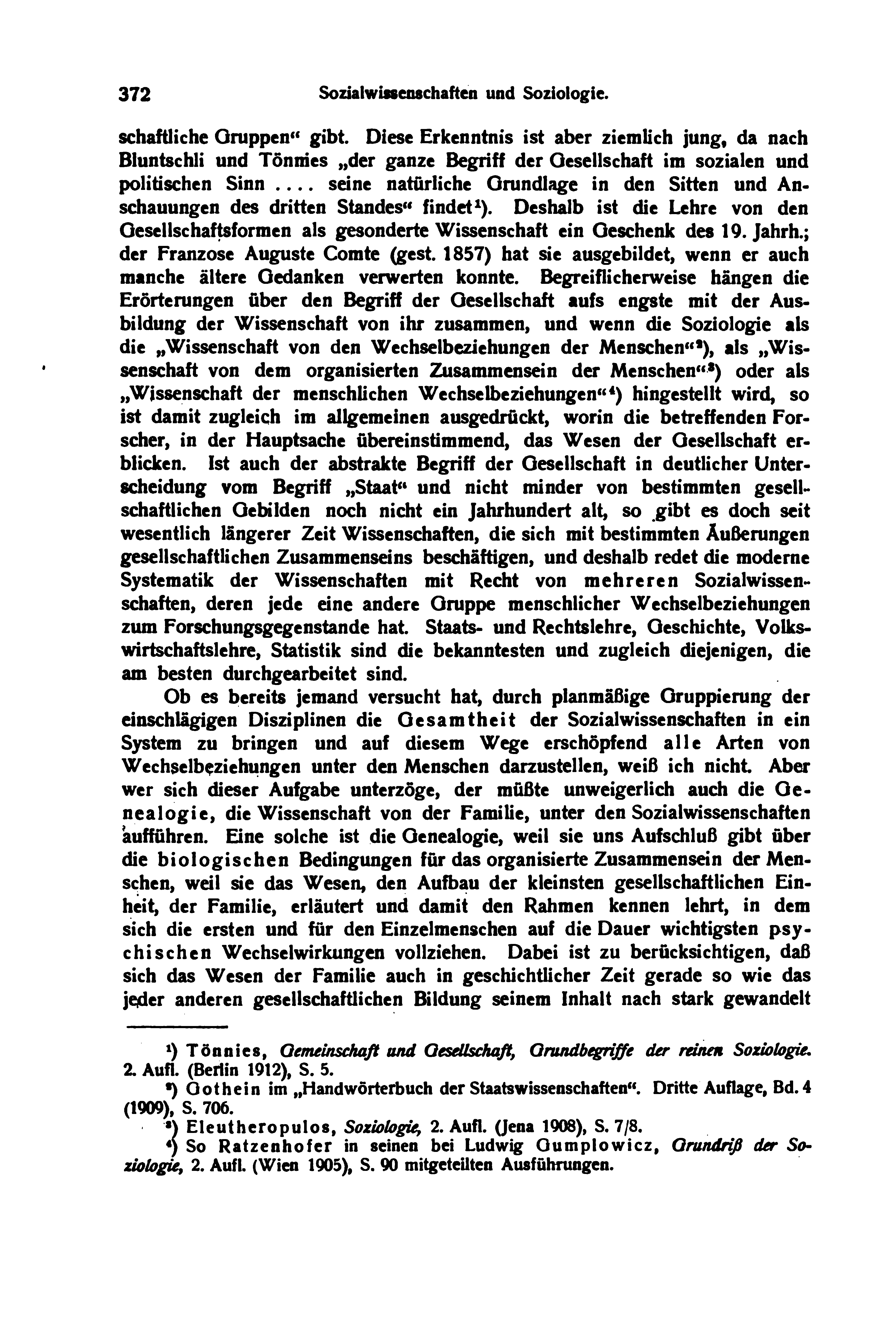Gruppen" gibt. Diese Erkenntnis ist aber ziemlich jung, da nach Bluntschli und Tönnies "der ganze Begriff der Gesellschaft im sozialen und politischen Sinn seine natürliche Grundlage in den Sitten und Anschauungen des dritten Standes" findet[1]. Deshalb ist die Lehre von den Gesellschaftsformen als gesonderte Wissenschaft ein Geschenk des 19. Jahrh.; der Franzose Auguste Comte (gest. 1857) hat sie ausgebildet, wenn er auch manche ältere Gedanken verwerten konnte. Begreiflicherweise hängen die Erörterungen über den Begriff der Gesellschaft aufs engste mit der Ausbildung der Wissenschaft von ihr zusammen, und wenn die Soziologie als die "Wissenschaft von den Wechselbeziehungen der Menschen"[2], als "Wissenschaft von dem organisierten Zusammensein der Menschen"[3] oder als "Wissenschaft der menschlichen Wechselbeziehungen"[4] hingestellt wird, so ist damit zugleich im allgemeinen ausgedrückt, worin die betreffenden Forscher, in der Hauptsache übereinstimmend, das Wesen der Gesellschaft erblicken. Ist auch der abstrakte Begriff der Gesellschaft in deutlicher Unterscheidung vom Begriff "Staat" und nicht minder von bestimmten gesellschaftlichen Gebilden noch nicht ein Jahrhundert alt, so gibt es doch seit wesentlich längerer Zeit Wissenschaften, die sich mit bestimmten Äußerungen gesellschaftlichen Zusammenseins beschäftigen, und deshalb redet die moderne Systematik der Wissenschaften mit Recht von mehreren Sozialwissenschaften, deren jede eine andere Gruppe menschlicher Wechselbeziehungen zum Forschungsgegenstande hat Staats- und Rechtslehre, Geschichte, Volkswirtschaftslehre, Statistik sind die bekanntesten und zugleich diejenigen, die am besten durchgearbeitet sind.