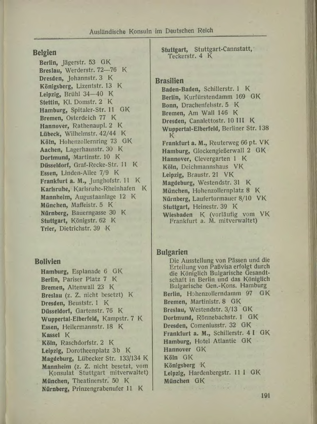 Brasilien Baden-Baden, Schillerstr. 1 K Berlin, Kurfürstendamm 169 OK Bonn, Drachenfelsstr. 5 K Bremen, Am Wall 146 K Dresden, Canalettostr. 10 III K Wuppertal-Elberfeld, Berliner Str. 138 K Frankfurt a. M., Reuterweg 66 pt. VK Hamburg, Glockengießerwall 2 GK Hannover, Clevergarten 1 K Köln, Deichmannshaus VK Leipzig, Braustr. 21 VK Magdeburg, Westendstr. 31 K München, Hohenzollernplatz 8 K Nürnberg, Laufertormauer 8/10 VK Stuttgart, Heinestr. 39 K Wiesbaden K (vorläufig vom VK Frankfurt a. M. mitverwaltet) Bulgarien Die Ausstellung von Pässen und die Erteilung von Paßvisa erfolgt durch die Königlich Bulgarische Gesandtschaft in Berlin und das Königlich Bulgarische Gen.-Kons. Hamburg Berlin, Hahenzollerndamm 97 GK Bremen, Martinistr. 8 GK Breslau, Westendstr. 3/13 GK Dortmund, Rönnebachstr. 1 GK Dresden, Comeniusstr. 32 GK Frankfurt a. M., Schillerstr. 4 I GK Hamburg, Hotel Atlantic GK Hannover GK Köln GK Königsberg K Leipzig, Hardenbergstr. 11 I GK München GK |