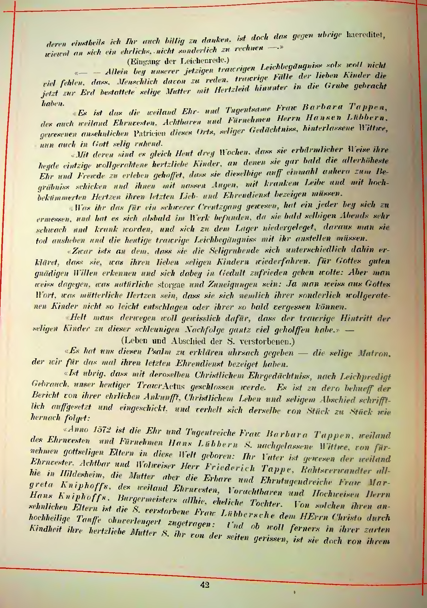 Anno 1572 ist die Ehr und Tugendreiche Frau Barbara Tappen, weiland des Ehrnvesten und Fürnehmen Hans Lübbern S. nachgelassene Wittwe, von fürnehmen gottseligen Eltern in diese Welt geboren: Ihr Vater ist gewesen der weiland Ehrnvester, Achtbar und Wolweiser Herr Friederich Tappe, Rathsverwandter allhie in Hildesheim, die Mutter aber die Erbare und Ehrntugendreiche Fraw Margreta Kniphoffs, des weiland Ehrnvesten, Vorachtbaren und Hochweisen Herrn Hans Kniphoffs, Burgermeisters allhie, eheliche Tochter. Von solchen ihren ansehnlichen Eltern ist die S. verstorbene Fraw Lübbersche dem HErrn Christo durch hochheilige Tauffe ohnverlengert zugetragen: Und ob woll ferners in ihrer zarten Kindheit ihre Hertzliebe Mutter S. ihr von der seiten gerissen, ist sie doch von ihrem