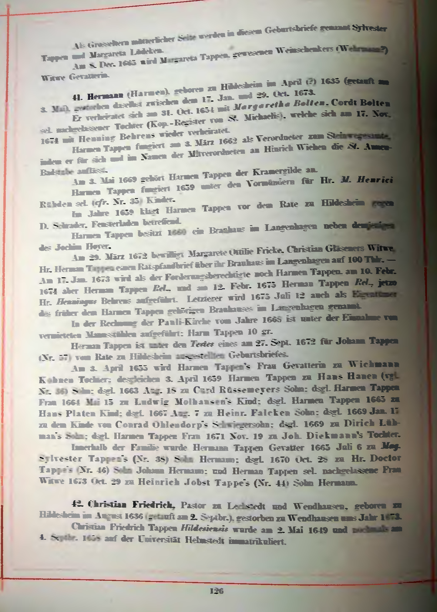 Herman Tappen ist unter des Testes eines am 27. Sept. 1672 für Johann Tappen (Nr. 57) vom rate zu Hildesheim ausgestellten Geburtsbriefes.