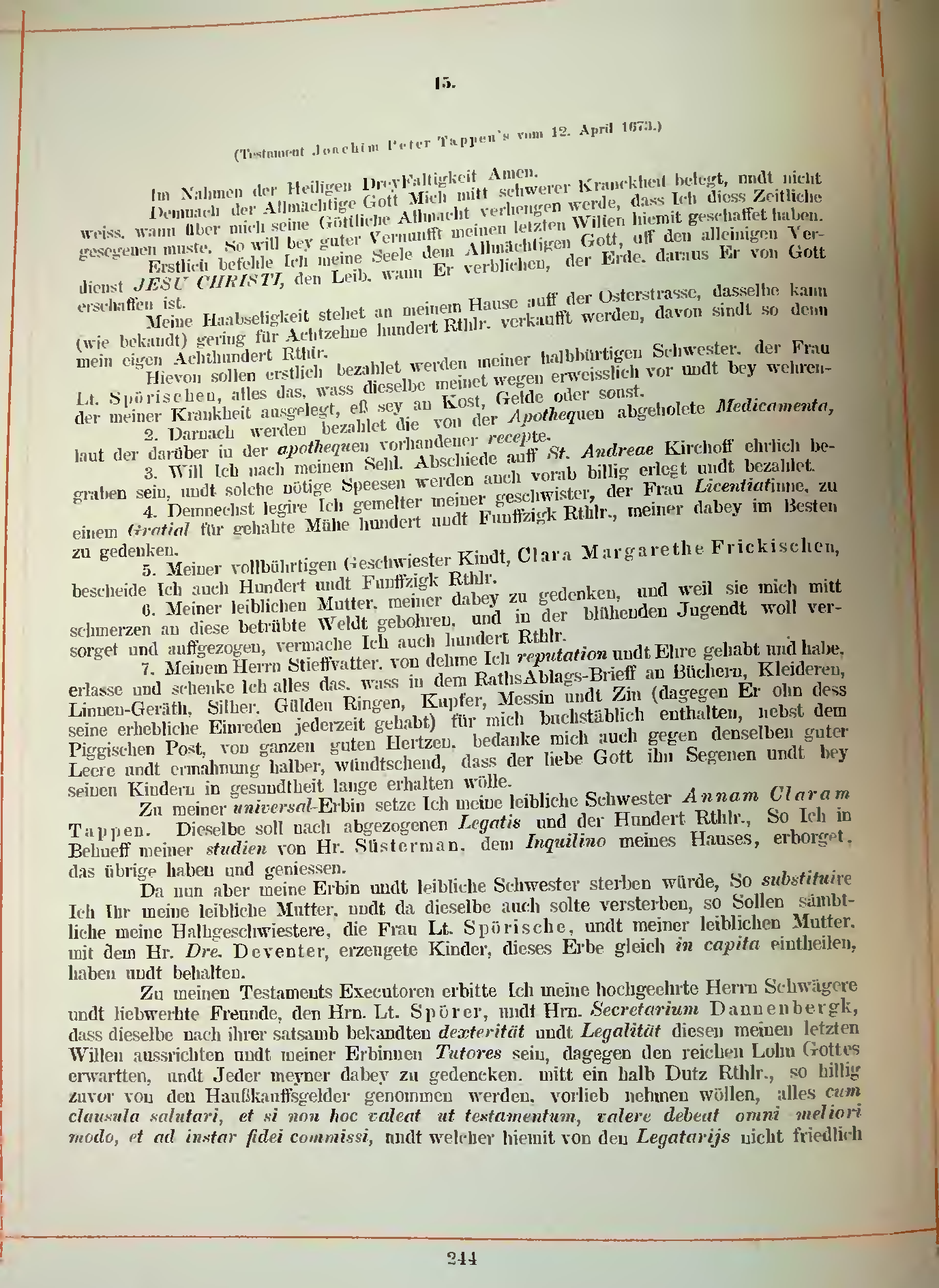 (Testament Joachim Peter Tappen’s vom 12. April 1673.)