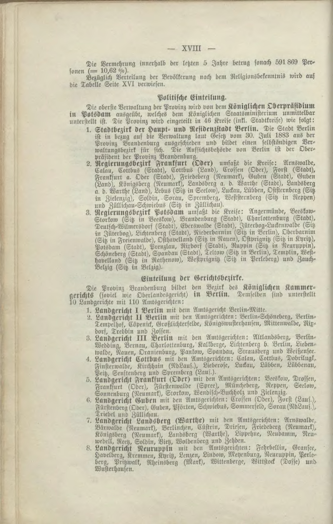 Die Provinz Brandenburg bildet den Bezirk des Königlichen Kammergerichts (soviel wie Oberlandesgericht) in Berlin. Demselben sind unterstellt 10 Landgerichte mit 110 Amtsgerichten: