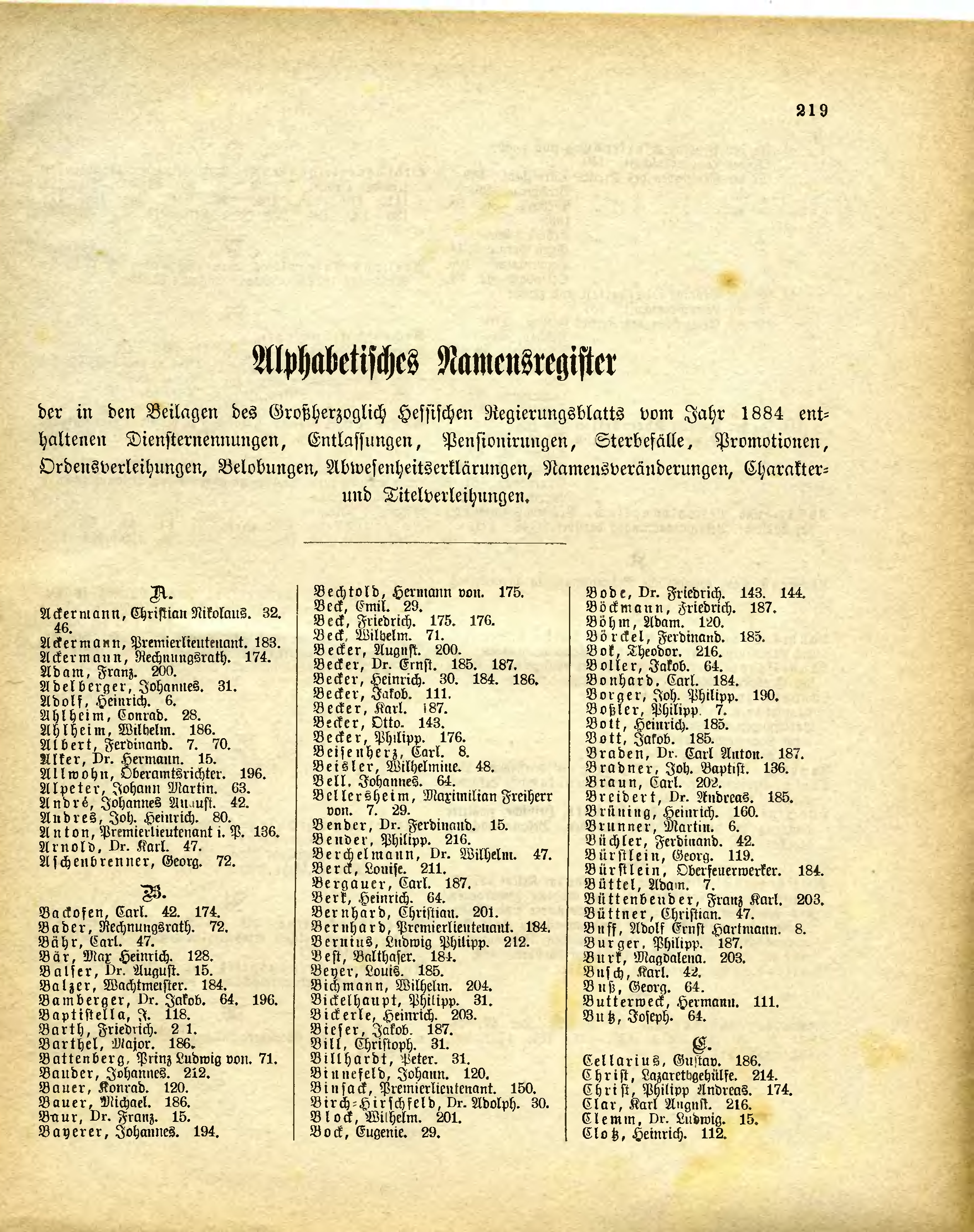 der in den Beilagen des Großherzoglich Hessischen Regierungsblatts vom Jahr 1884 enthaltenen Diensternennungen, Entlassungen, Pensionirungen, Sterbefälle, Promotionen, Ordensverleihungen, Belobungen, Abwesenheitserklärungen, Namensveränderungen, Charakter- und Titelverleihungen.