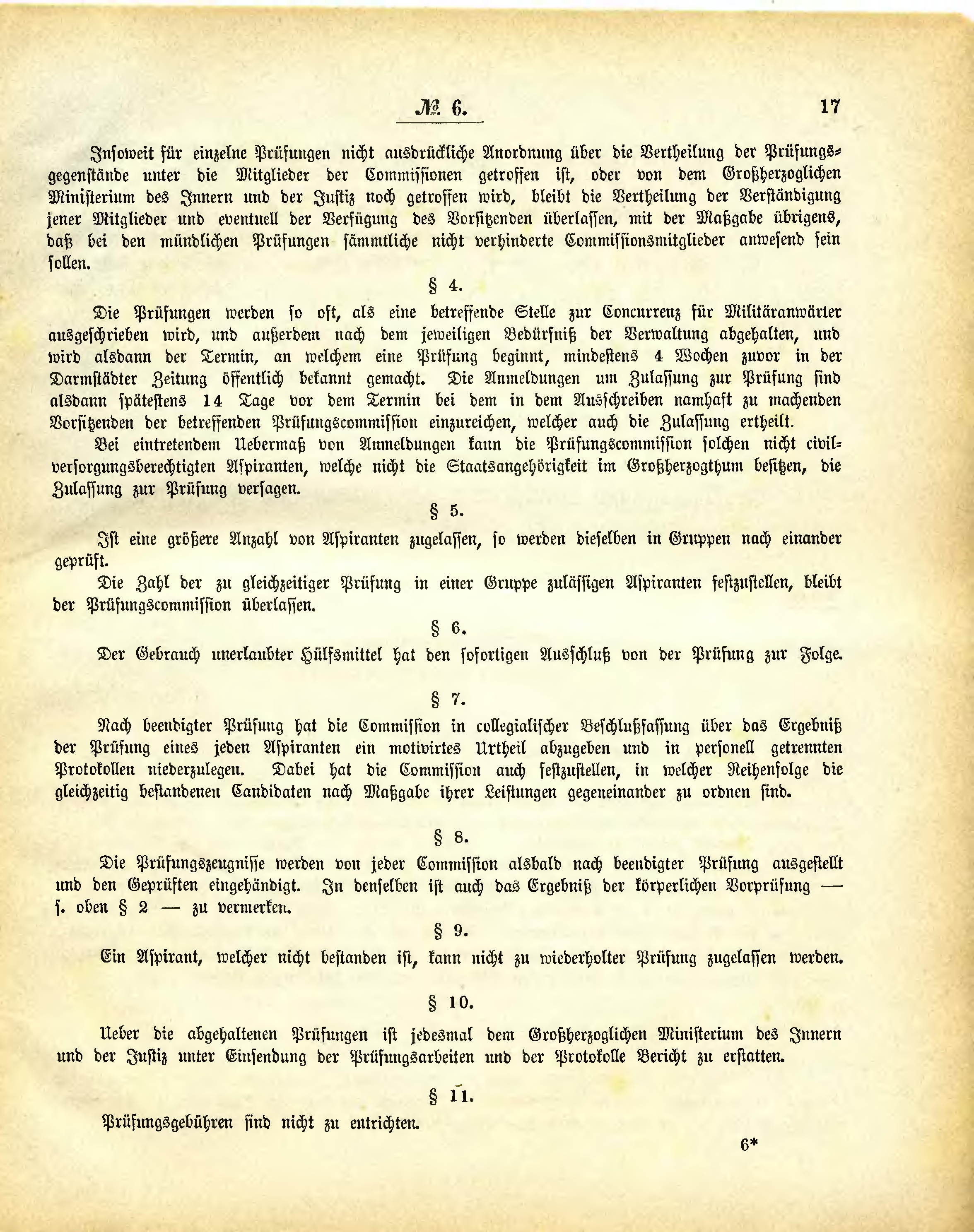 Die Prüfungen werden so oft, als eine betreffende Stelle zur Concurrenz für Militäranwärter ausgeschrieben wird, und außerdem nach dem jeweiligen Bedürfniß der Verwaltung abgehalten, und wird alsdann der Termin, an welchem eine Prüfung beginnt, mindestens 4 Wochen zuvor in der Darmstädter Zeitung öffentlich bekannt gemacht. Die Anmeldungen um Zulassung zur Prüfung sind alsdann spätestens 14 Tage vor dem Termin bei dem in dem Ausschreiben namhaft zu machenden Vorsitzenden der betreffenden Prüfungscommission einzureichen, welcher auch die Zulassung ertheilt.