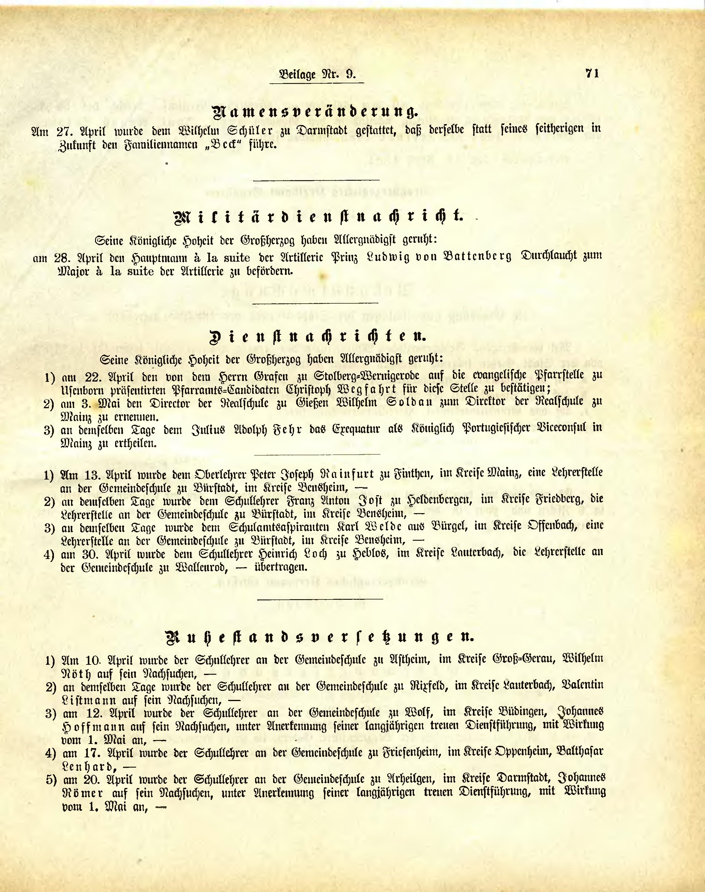 | 5) | am 20. April wurde der Schullehrer an der Gemeindeschule zu Arheilgen, im Kreise Darmstadt, Johannes Römer auf sein Nachsuchen, unter Anerkennung seiner langjährigen treuen Dienstführung, mit Wirkung vom 1. Mai an, - |