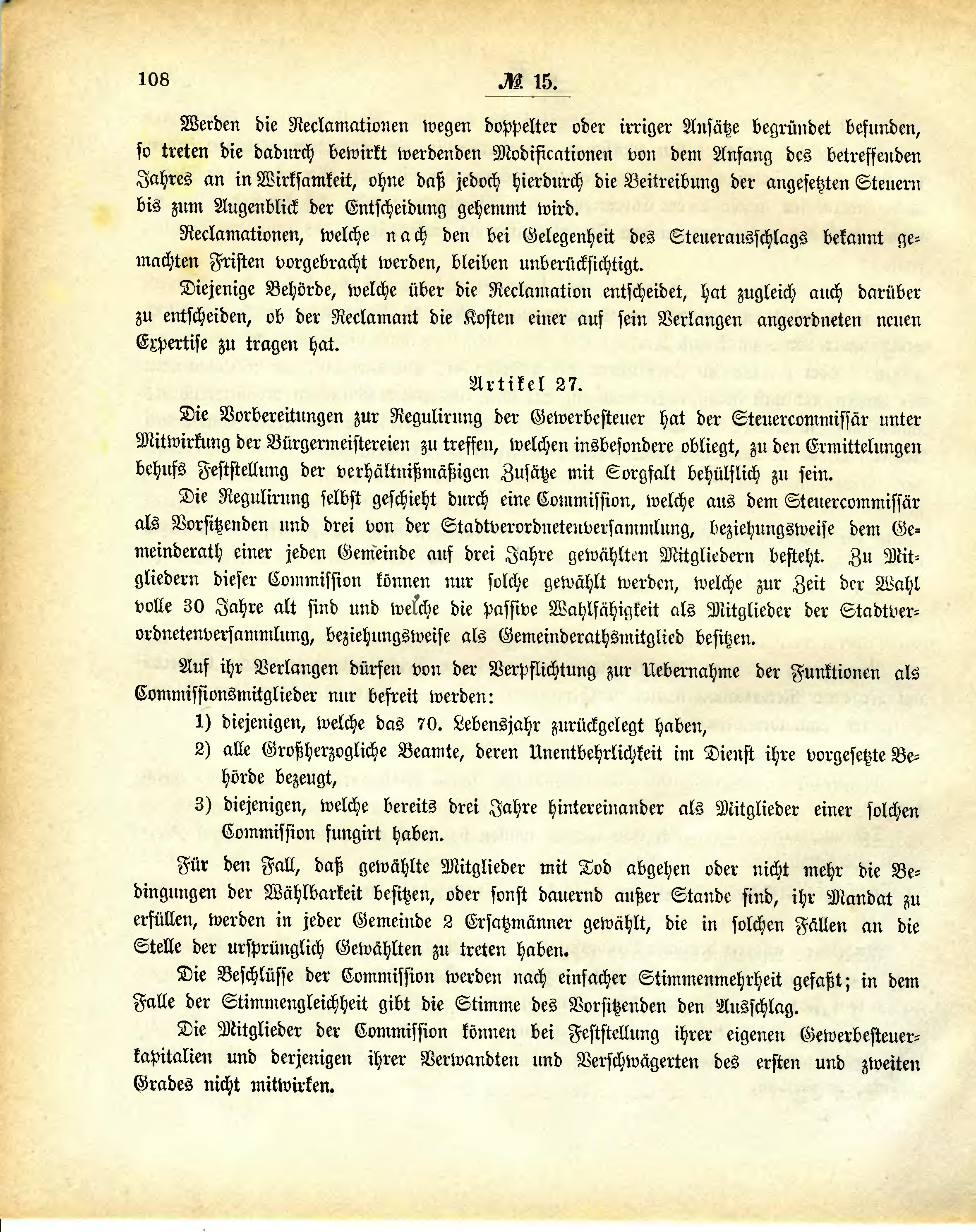 Die Regulirung selbst geschieht durch eine Commission, welche aus dem Steuercommissär als Vorsitzenden und drei von der Stadtverordnetenversammlung, beziehungsweise dem Gemeinderath einer jeden Genfeinde auf drei Jahre gewählten Mitgliedern besteht. Zu Mitgliedern dieser Commission können nur solche gewählt werden, welche zur Zeit der Wahl volle 30 Jahre alt sind und welche die passive Wahlfähigkeit als Mitglieder der Stadtverordnetenversammlung, beziehungsweise als Gemeinderathsmitglied besitzen.