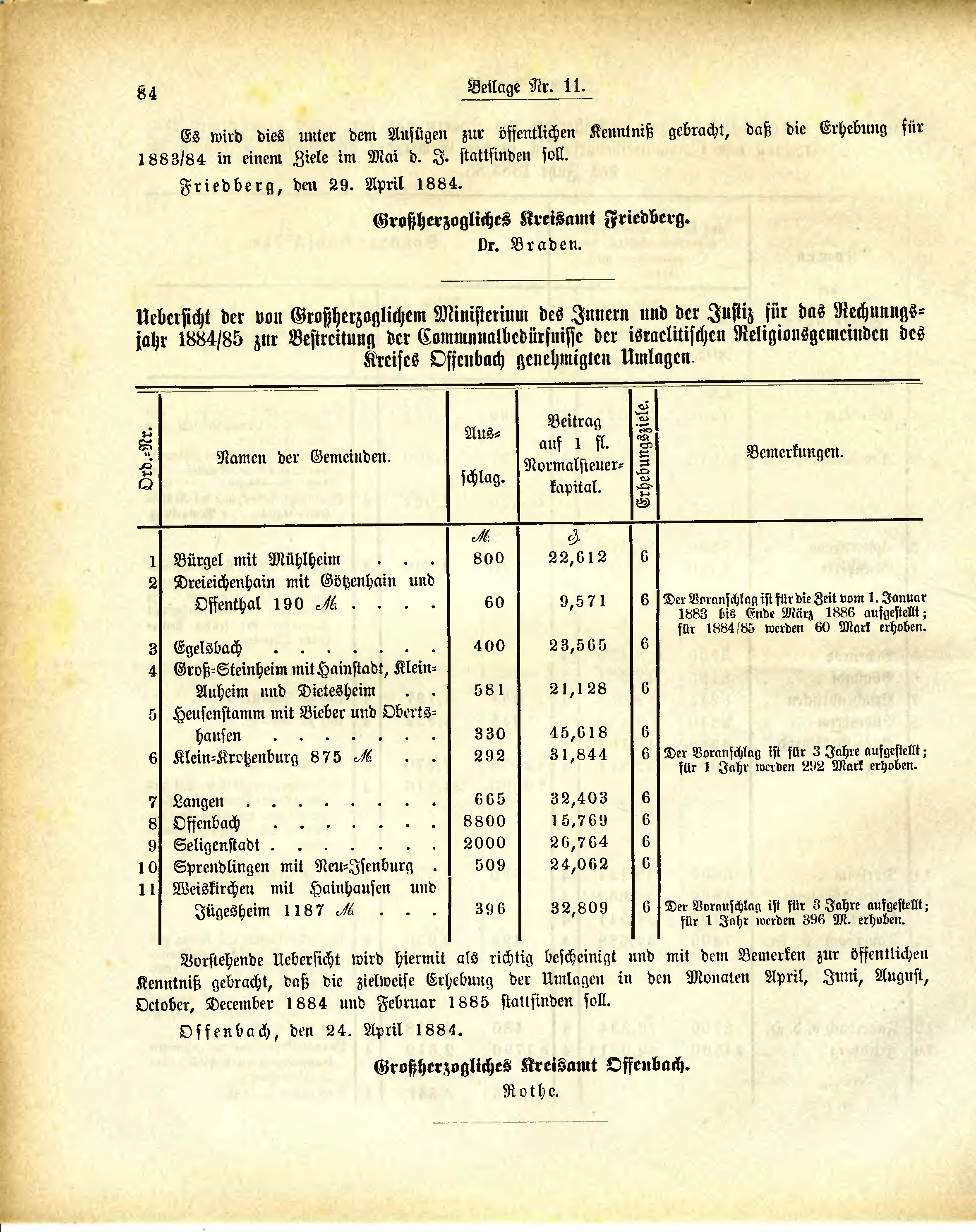 Uebersicht der von Großherzoglichem Ministerium des Innern und der Justiz für das Rechnungsjahr 1884/85 zur Bestreitung der Communalbedürfnisse der israelitischen Religionsgemeinden des Kreises Offenbach genehmigten Umlagen.