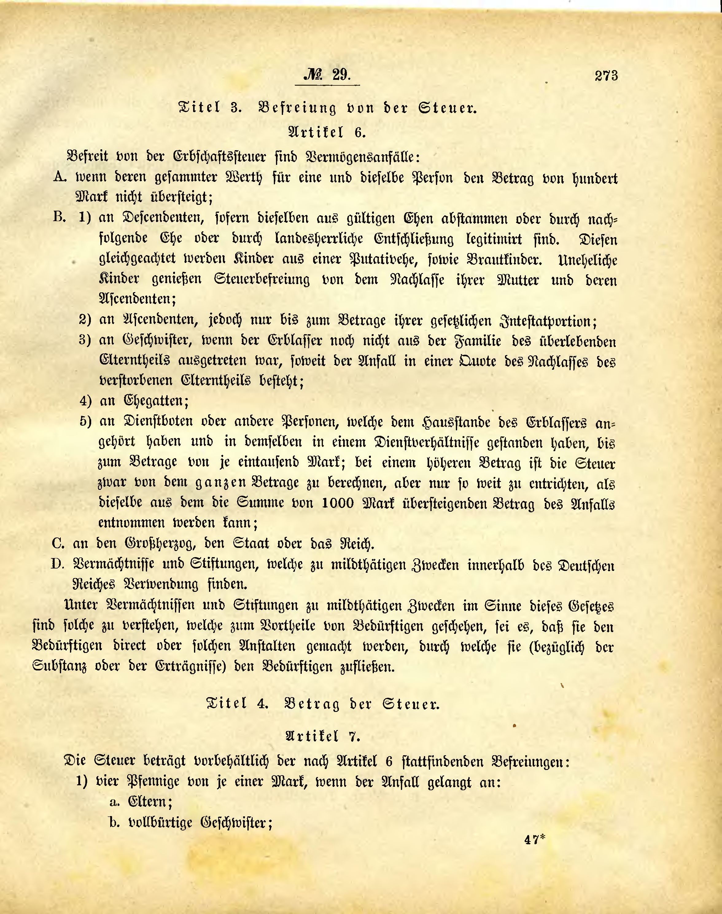 | B. | 1) | an Descendenten, sofern dieselben aus gültigen Ehen abstammen oder durch nachfolgende Ehe oder durch landesherrliche Entschließung legitimirt sind. Diesen gleichgeachtet werden Kinder aus einer Putativehe, sowie Brautkinder. Uneheliche Kinder genießen Steuerbefreiung von dem Nachlasse ihrer Mutter und deren Ascendenten; |