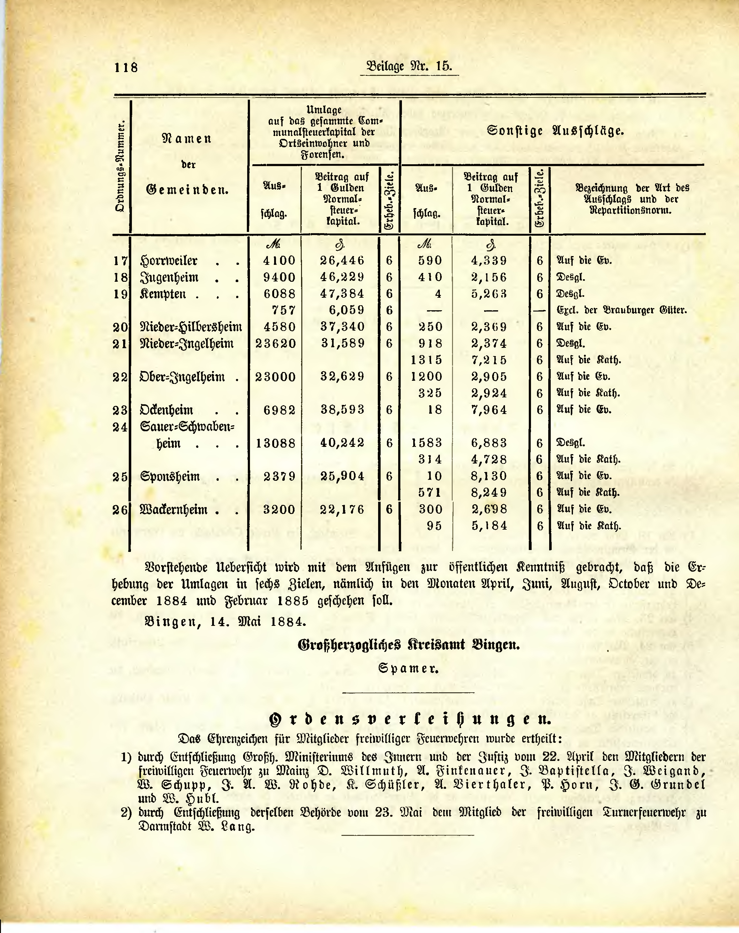| 1) | durch Entschließung Großh. Ministeriums des Innern und der Justiz vom 22. April den Mitgliedern der freiwilligen Feuerwehr zu Mainz D. Willmuth, A. Finkenauer, J. Baptistella, J. Weigand, W. Schupp, J. A. W. Rohde, K. Schüßler, A. Vierthaler, P. Horn, J. G. Grundel und W. Hubl. | |