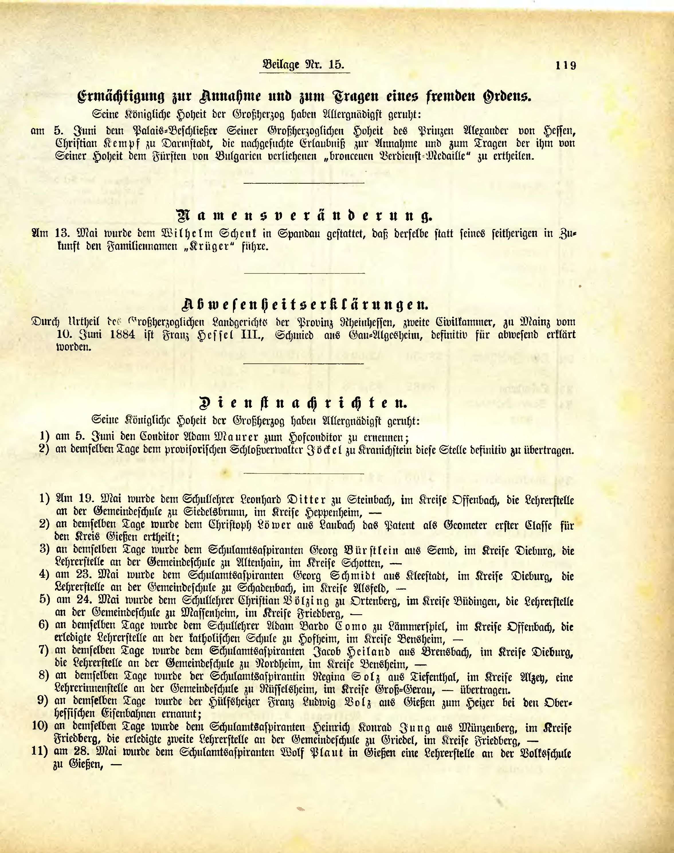 | 4) | am 23. Mai wurde dem Schulamtsaspiranten Georg Schmidt aus Kleestadt, im Kreise Dieburg, die Lehrerstelle an der Gemeindeschule zu Schadenbach, im Kreise Alsfeld, - | |