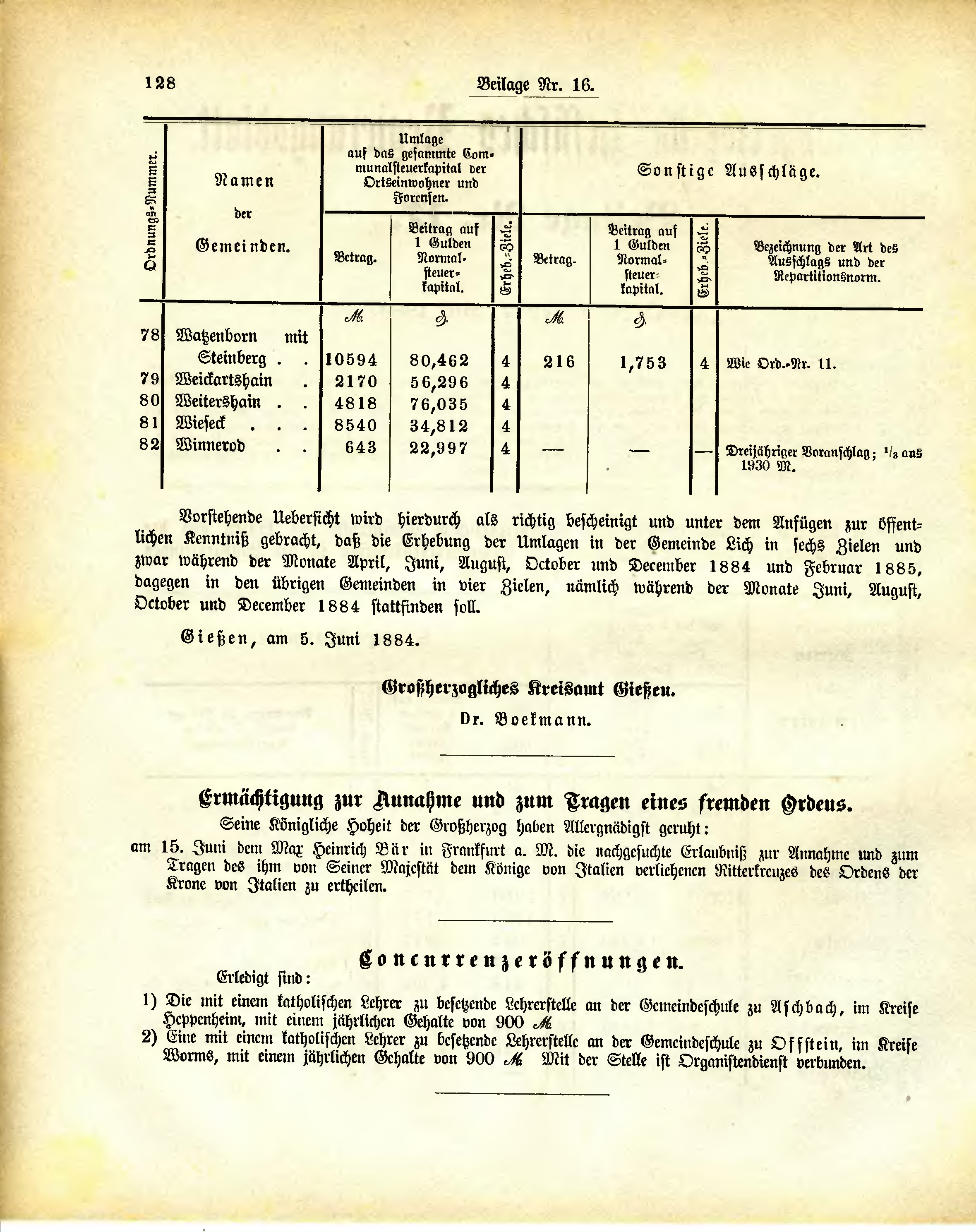 Vorstehende Uebersicht wird hierdurch als richtig bescheinigt und unter dem Anfügen zur öffentlichen Kenntniß gebracht, daß die Erhebung der Umlagen in der Gemeinde Lich in sechs Zielen und zwar während der Monate April, Juni, August, October und December 1884 und Februar 1885, dagegen in den übrigen Gemeinden in vier Zielen, nämlich während der Monate Juni, August, October und December 1884 stattfinden soll.
