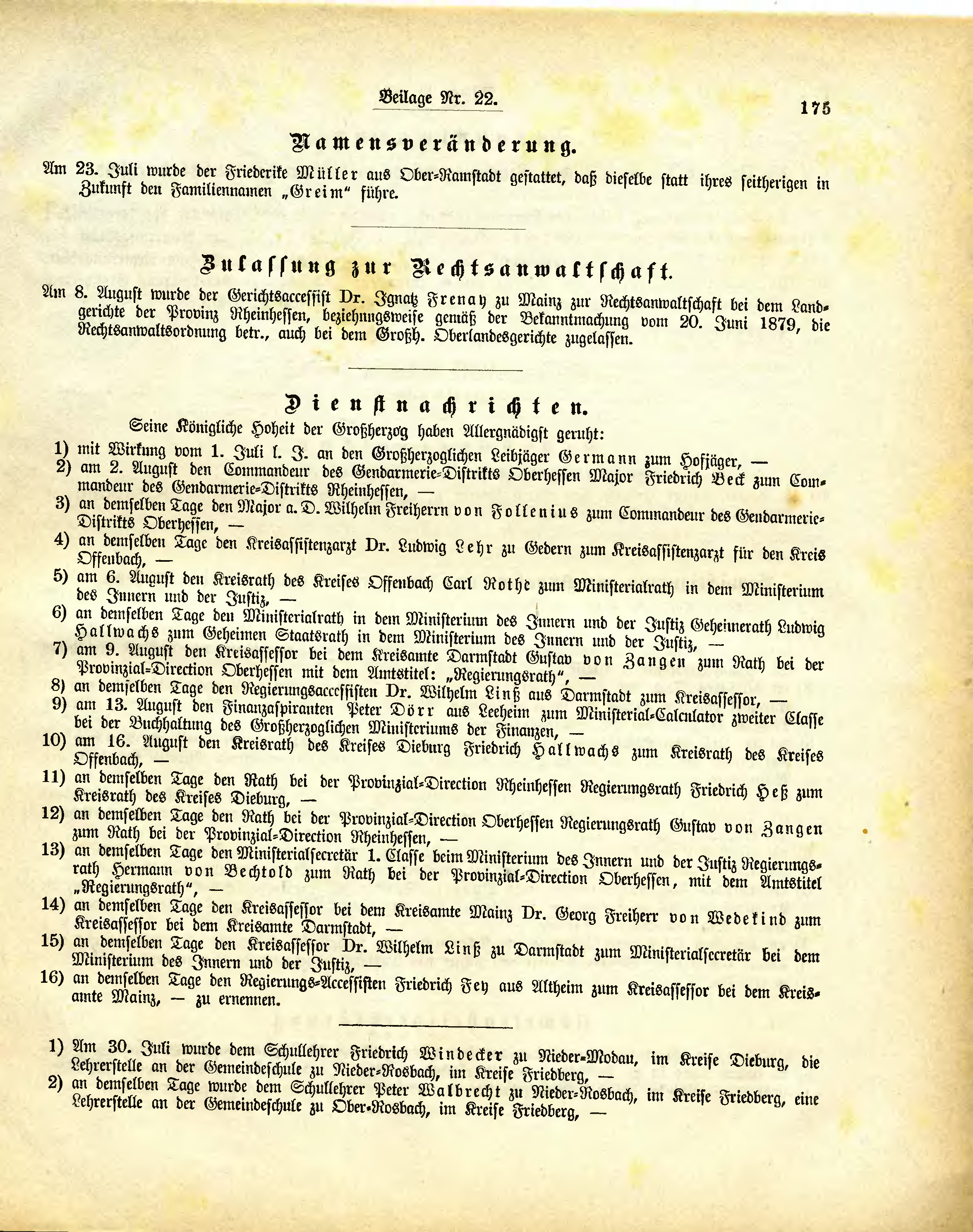 Am 8. August wurde der Gerichtsaccessist Dr. Ignatz Frenay zu Mainz zur Rechtsanwaltschaft bei dem Landgerichte der Provinz Rheinhessen, beziehungsweise gemäß der Bekanntmachung vom 20. Juni 1879, die Rechtsanwaltsordnung betr., auch bei dem Großh. Oberlandesgerichte zugelassen.