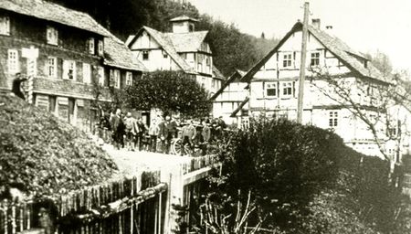 Das Fachwerkhaus auf der rechten Seite ist die alte Gastwirtschaft. Im Gasthaus des Wirtes Lippe befand sich auch die Schulstube. Das Haus wurde 1907 von einem Erdrutsch bedroht und später abgebrochen.