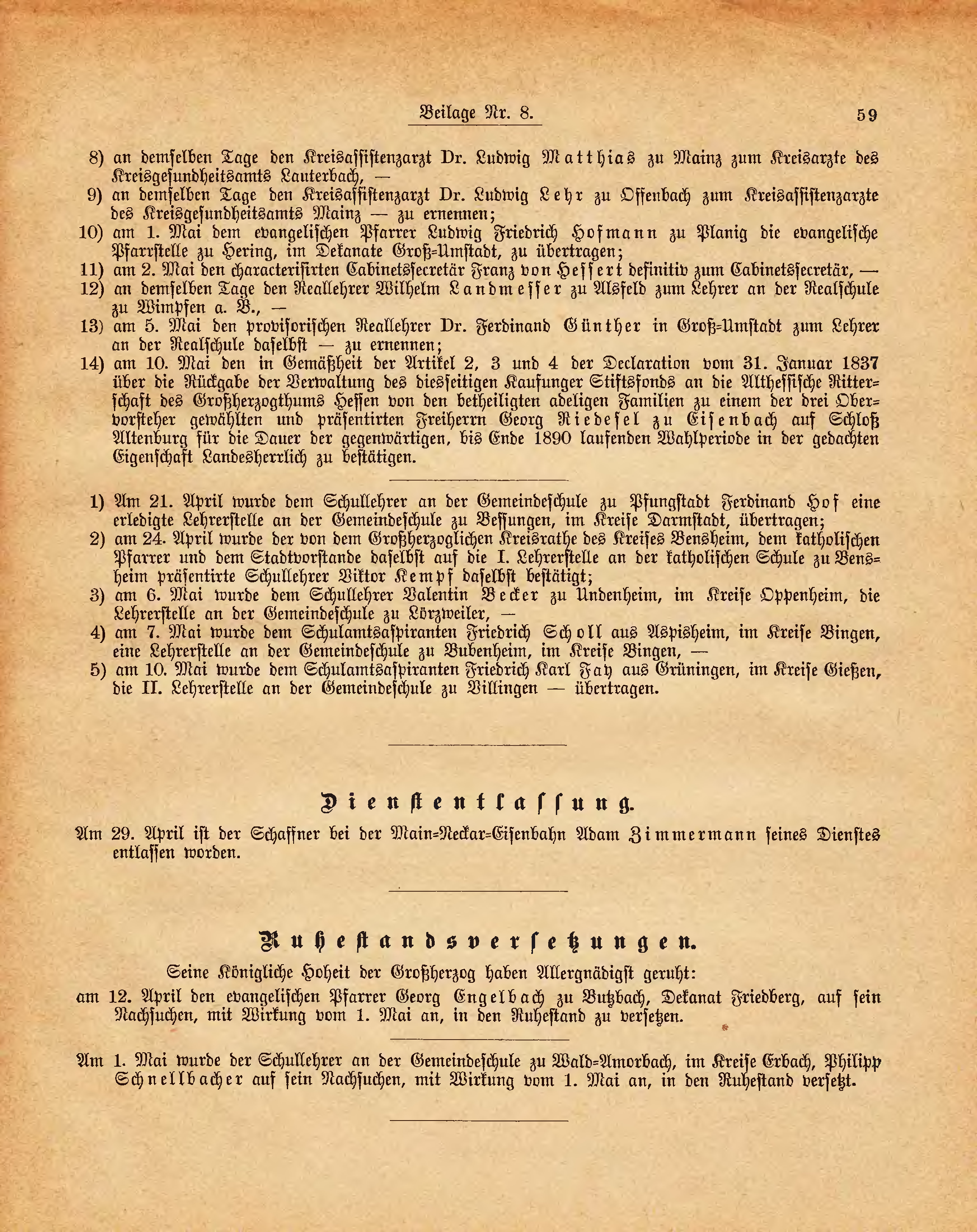 | 8) | an demselben Tage den Kreisassistenzarzt Dr. Ludwig Matthias zu Mainz zum Kreizarzte des Kreisgesundheitsamts Lauterbach, - |