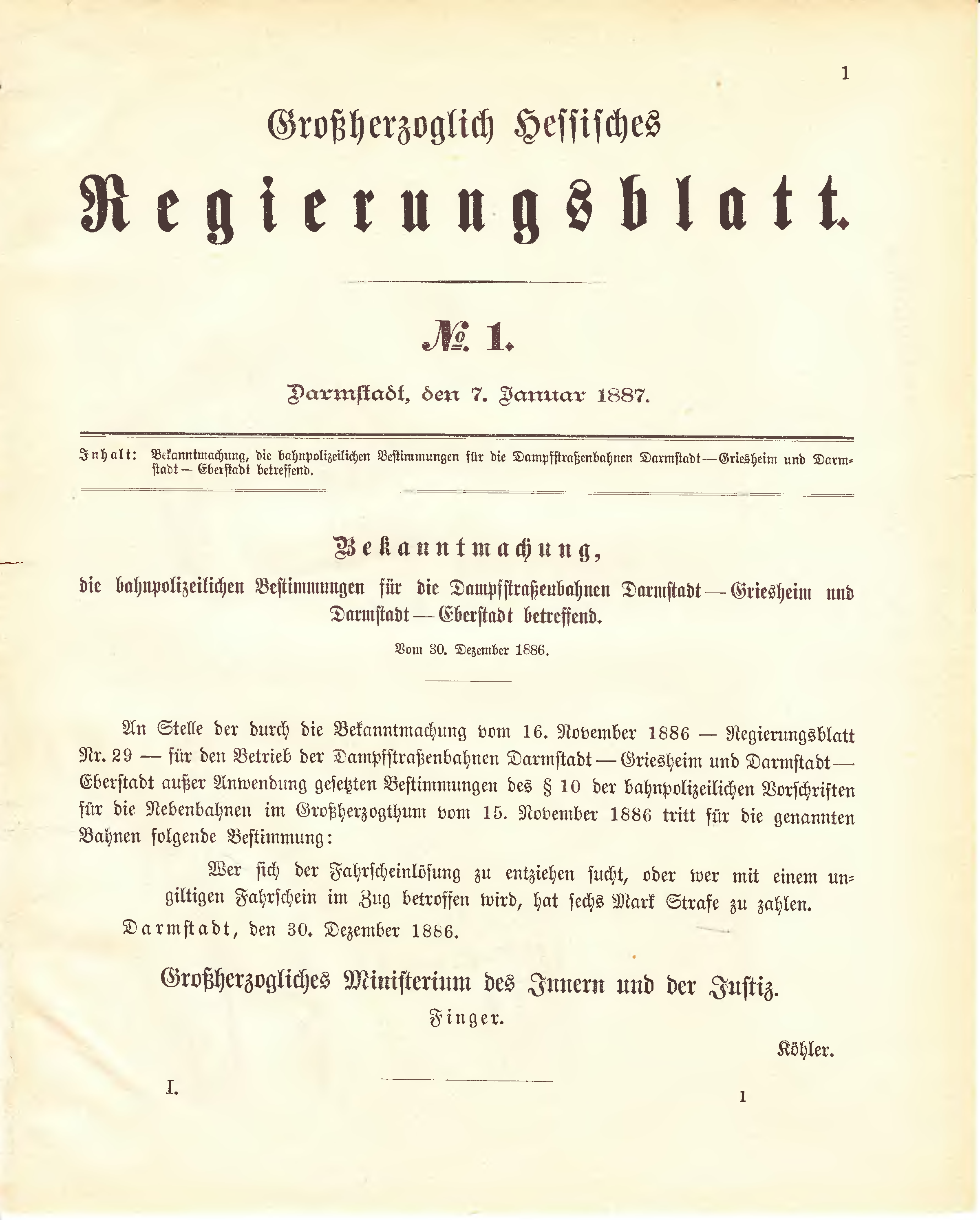 die bahnpolizeilichen Bestimmungen für die Dampfstraßenbahnen Darmstadt-Griesheim und Darmstadt-Eberstadt betreffend. Vom 30. Dezember 1886. |