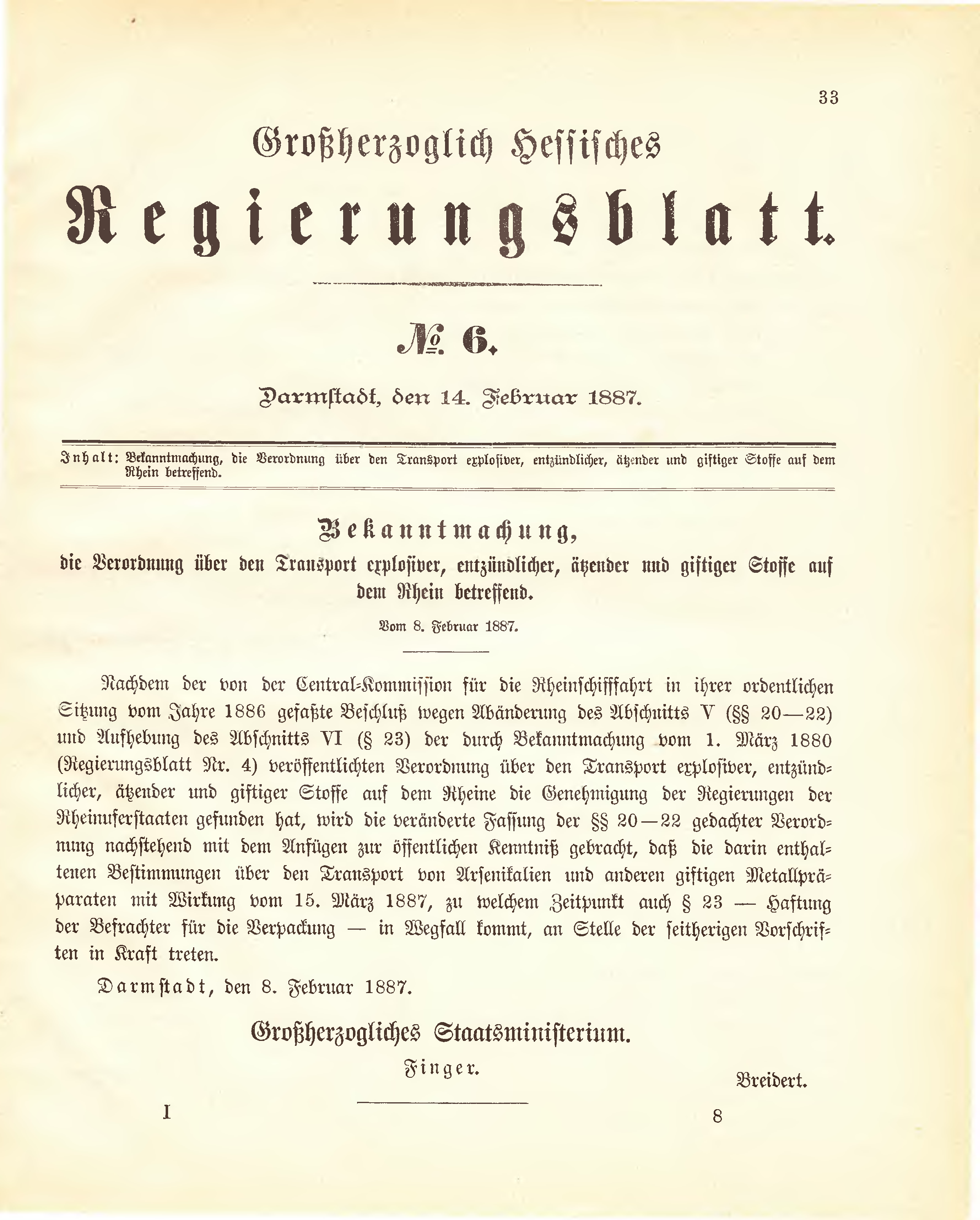 Nachdem der von der Central-Kommission für die Rheinschifffahrt in ihrer ordentlichen Sitzung vom Jahre 1886 gefaßte Beschluß wegen Abänderung des Abschnitts V (§§ 20-22) und Aufhebung des Abschnitts VI (§ 23) der durch Bekanntmachung vom 1. März 1880 (Regierungsblatt Nr. 4) veröffentlichten Verordnung über den Transport explosiver, entzündlicher, ätzender und giftiger Stoffe auf dem Rheine die Genehmigung der Regierungen der Rheinuferstaaten gefunden hat, wird die veränderte Fassung der §§ 20-22 gedachter Verordnung nachstehend mit dem Anfügen zur öffentlichen Kenntniß gebracht, daß die darin enthaltenen Bestimmungen über den Transport von Arsenikalien und anderen giftigen Metallpräparaten mit Wirkung vom 15. März 1887, zu welchem Zeitpunkt auch § 23 - Haftung der Befrachter für die Verpackung - in Wegfall kommt, an Stelle der seitherigen Vorschriften in Kraft treten.