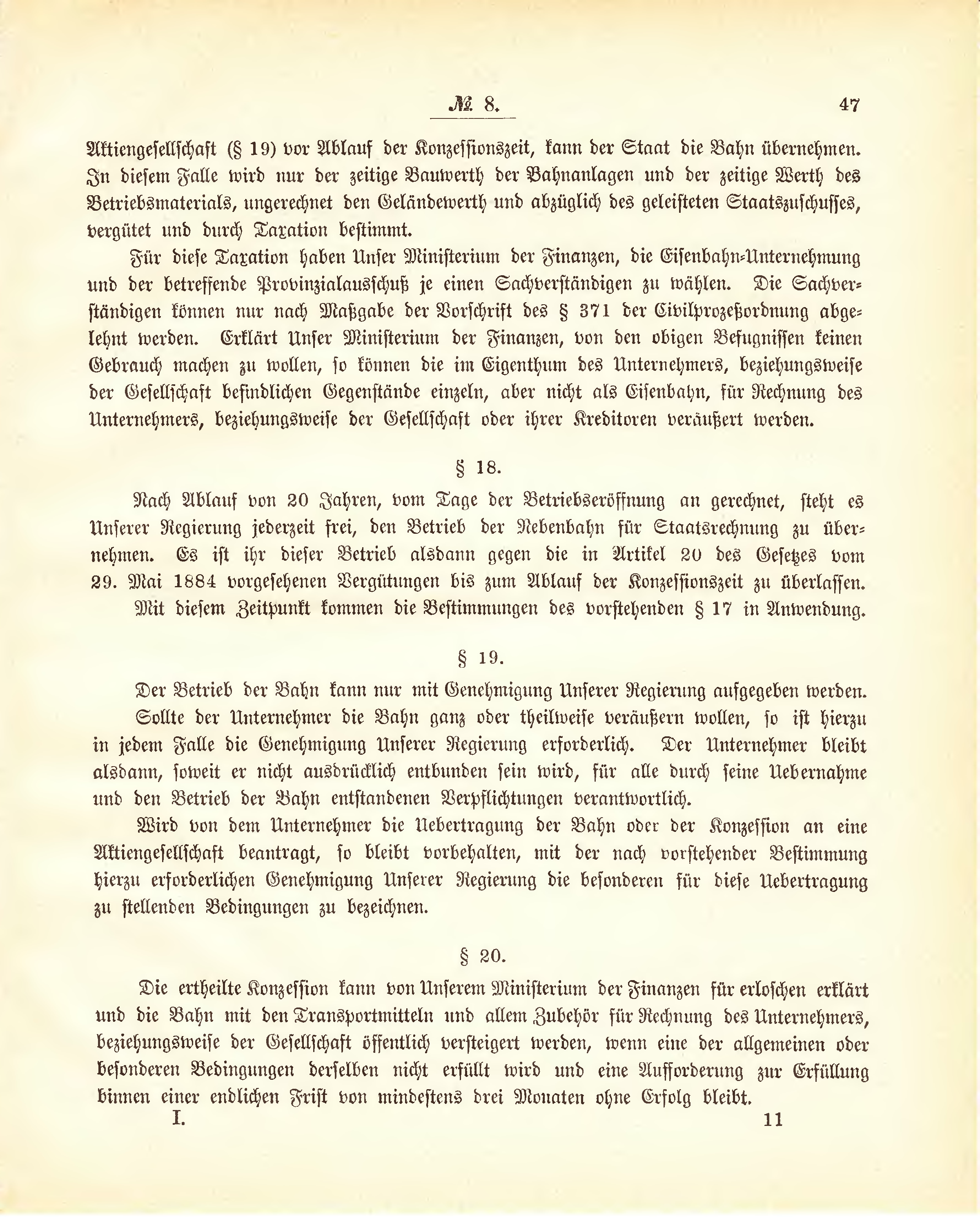 Nach Ablauf von 20 Jahren, vom Tage der Betriebseröffnung an gerechnet, steht es Unserer Regierung jederzeit frei, den Betrieb der Rebenbahn für Staatsrechnung zu übernehmen. Es ist ihr dieser Betrieb alsdann gegen die in Artikel 20 des Gesetzes vom 29. Mai 1884 vorgesehenen Vergütungen bis zum Ablauf der Konzessionszeit zu überlassen.