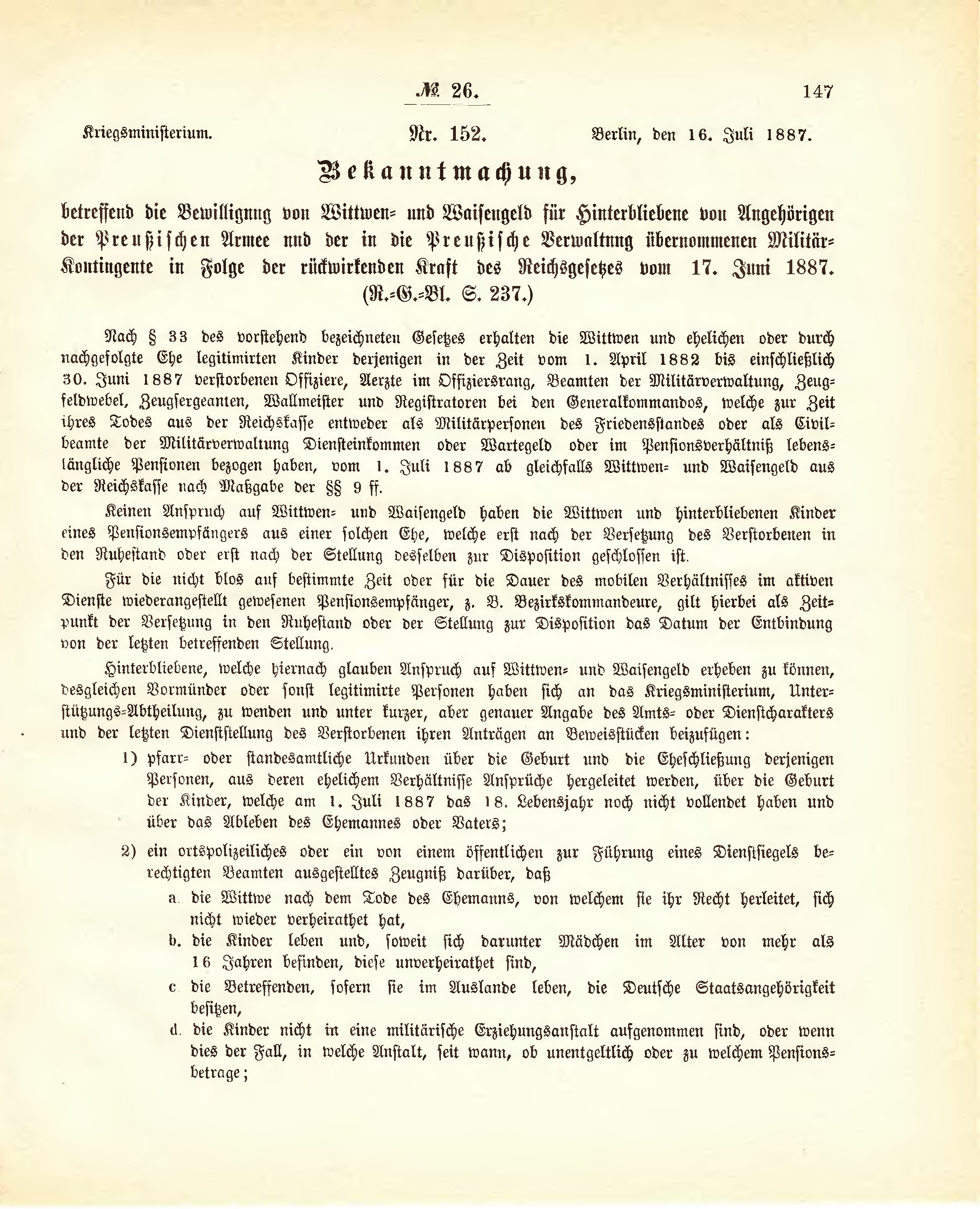 betreffend die Bewilligung von Wittwen- und Waisengeld für Hinterbliebene von Angehörigen der Preußischen Armee und der in die Preußische Verwaltung übernommenen Militär-Kontingente in Folge der rückwirkenden Kraft des Reichsgesetzes vom 17. Juni 1887.