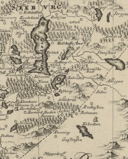 Bischofburg auf der Endersch Karte von 1755 - Tabula geographica episcopatum Warmiensem in Prussia exhibens, Heilsberg, solita habitatio episcopalis / Joannes Fridericus Endersch - Historische Karte des Bistums Ermland / gallica.bnf.fr / Bibliothèque nationale de France