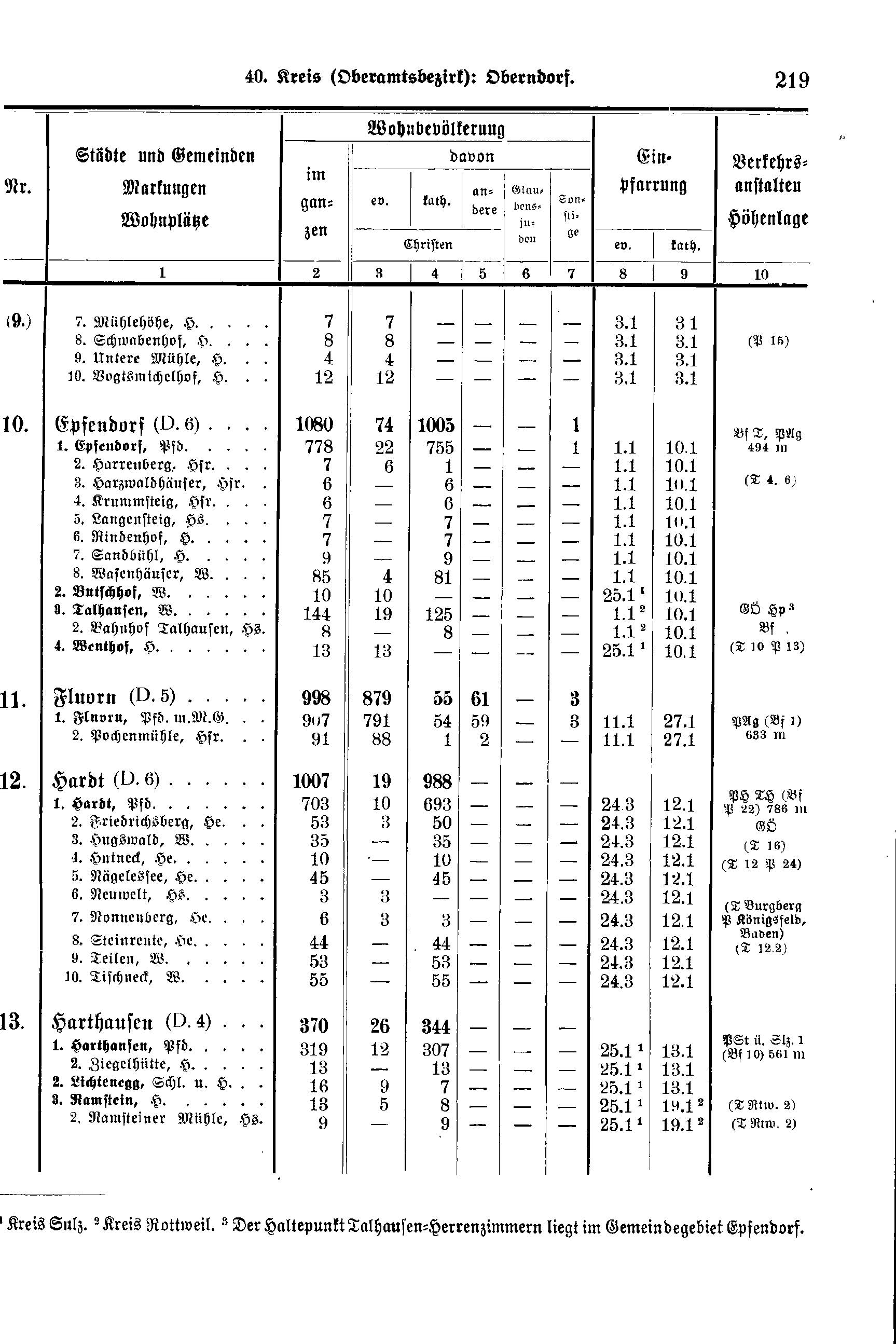 Wohnbevölkerung | Einpfarrung | Verkehrs-anstalten Höhenlage | ||||||