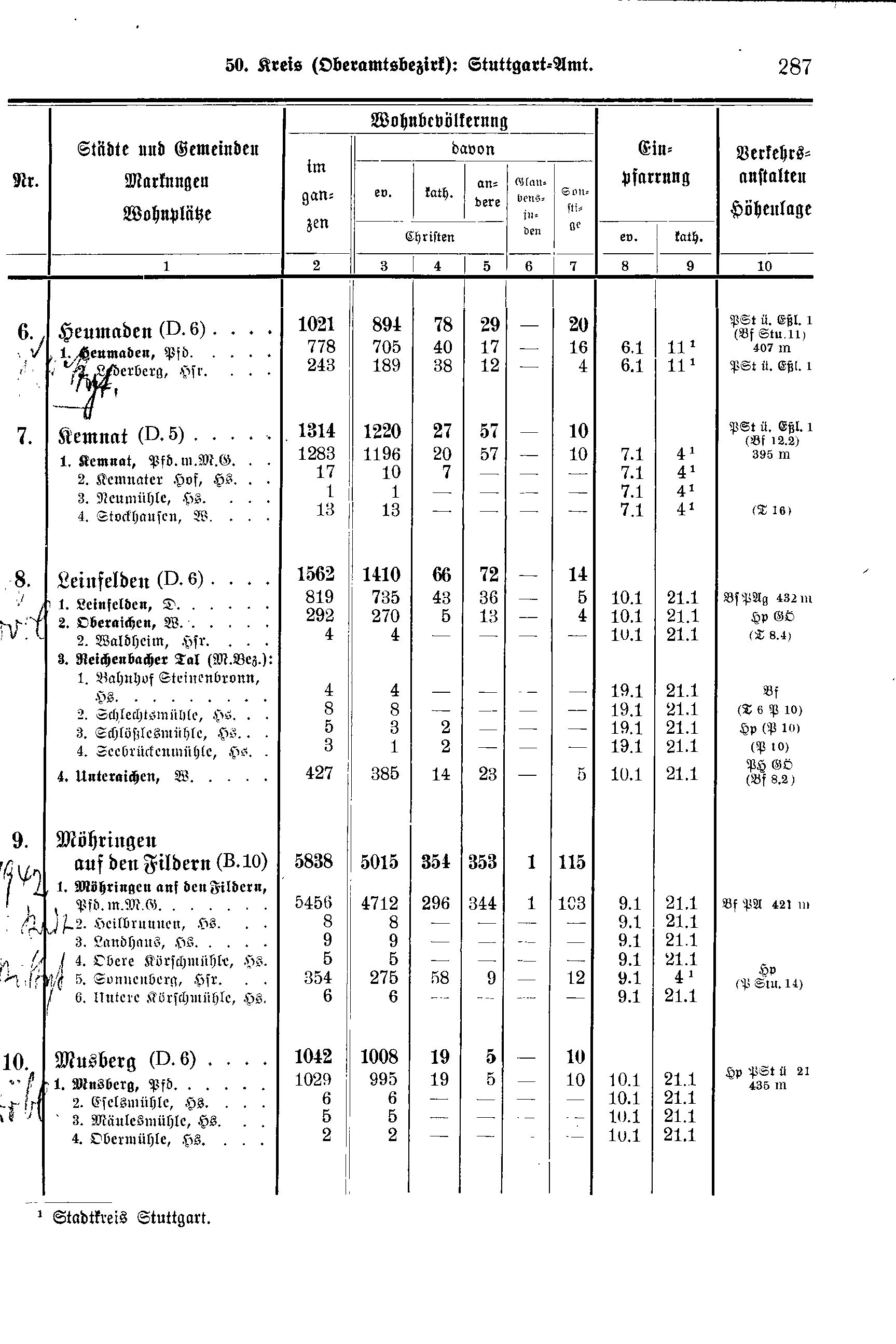 Wohnbevölkerung | Einpfarrung | Verkehrs-anstalten Höhenlage | ||||||