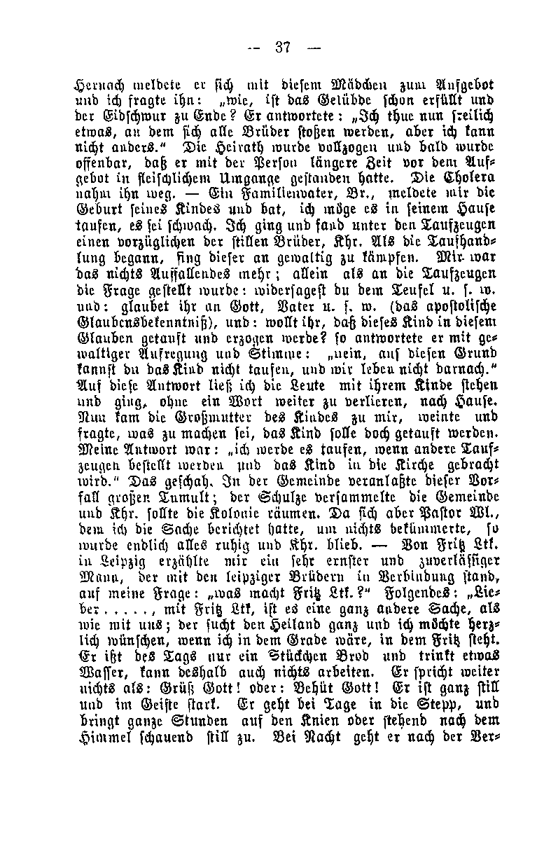 Hernach meldete er sich mit diesem Mädchen zum Aufgebot und ich fragte ihn: „wie, ist das Gelübde schon erfüllt und der Eidschwur zu Ende? Er antwortete: „Ich thue nun freilich etwas, an dem sich alle Brüder stoßen werden, aber ich kann nicht anders.“ Die Heirath wurde vollzogen und bald wurde offenbar, daß er mit der Person längere Zeit vor dem Aufgebot in fleischlichem Umgange gestanden hatte. Die Cholera nahm ihn weg. - Ein Familienvater, Br., meldete mir die Geburt seines Kindes und bat, ich möge es in seinem Hause taufen, es sei schwach. Ich ging und fand unter den Taufzeugen einen vorzüglichen der stillen Brüder, Khr. Als die Taufhandlung begann, fing dieser an gewaltig zu kämpfen. Mir war das nichts Auffallendes mehr; allein als an die Taufzeugen die Frage gestellt wurde: widersagest du dem Teufel u. s. w. und: glaubet ihr an Gott, Vater u. s. w. (das apostolische Glaubensbekenntniß), und: wollt ihr, daß dieses Kind in diesem Glauben getauft und erzogen werde? so antwortete er mit gewaltiger Aufregung und Stimme: „nein, aus diesem Grund kannst du das Kind nicht taufen, und wir leben nicht darnach.“ Auf diese Antwort ließ ich die Leute mit ihrem Kinde stehen und ging, ohne ein Wort weiter zu verlieren, nach Hause. Nun kam die Großmutter des Kindes zu mir, weinte und fragte, was zu machen sei, das Kind solle doch getauft werden. Meine Antwort war: „ich werde es taufen, wenn andere Taufzeugen bestellt werden und das Kind in die Kirche gebracht wird.“ Das geschah. In der Gemeinde veranlaßte dieser Vorfall großen Tumult; der Schulze versammelte die Gemeinde und Khr. sollte die Kolonie räumen. Da sich aber Pastor Wl., dem ich die Sache berichtet hatte, um nichts bekümmerte, so wurde endlich alles ruhig und Khr. blieb. - Von Fritz Ltk. in Leipzig erzählte mir ein sehr ernster und zuverlässiger Mann, der mit den leipziger Brüdern in Verbindung stand, auf meine Frage: „was macht Fritz Ltk.?“ Folgendes: „Lieber …, mit Fritz Ltk., ist es eine ganz andere Sache, als wie mit uns; der sucht den Heiland ganz und ich möchte herzlich wünschen, wenn ich in dem Grade wäre, in dem Fritz steht. Er ißt des Tags nur ein Stückchen Brod und trinkt etwas Wasser, kann deshalb auch nichts arbeiten. Er spricht weiter nichts als: Grüß Gott! oder: Behüt Gott! Er ist ganz still und im Geiste stark. Er geht bei Tage in die Stepp, und bringt ganze Stunden auf den Knien oder stehend nach dem Himmel schauend still zu. Bei Nacht geht er nach der Versammlung