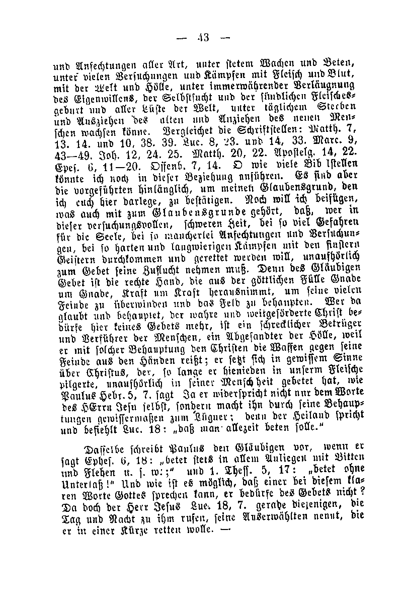 und Anfechtungen aller Art, unter stetem Wachen und Beten, unter vielen Versuchungen und Kämpfen mit Fleisch und Blut, mit der Welt und Hölle, unter immerwährender Verläugnung des Eigenwillens, der Selbstsucht und der sündlichen Fleischesgeburt und aller Lüste der Welt, unter täglichem Sterben und Ausziehen des alten und Anziehen des neuen Menschen wachsen könne. Vergleichet die Schriftstellen: Matth. 7, 13. 14. und 10, 38. 39. Luc. 8, 23. und 14, 33. Marc. 9, 43-49. Joh. 12, 24. 25. Matth. 20, 22. Apostelg. 14, 22. Epes. 6, 11-20. Offenb. 7, 14. O wie viele Bibelstellen könnte ich noch in dieser Beziehung anführen. Es sind aber die vorgeführten hinlänglich, um meinen Glaubensgrund, den ich euch hier darlege, zu bestätigen. Noch will ich beifügen, was auch mit zum Glaubensgrunde gehört, daß, wer in dieser versuchungsvollen, schweren Zeit, bei so viel Gefahren für die Seele, bei so mancherlei Anfechtungen und Versuchungen, bei so harten und langwierigen Kämpfen mit den finstern Geistern durchkommen und gerettet werden will, unaufhörlich zum Gebet seine Zuflucht nehmen muß. Denn des Gläubigen Gebet ist die rechte Hand, die aus der göttlichen Fülle Gnade um Gnade, Kraft um Kraft herausnimmt, um seine vielen Feinde zu überwinden und das Feld zu behaupten. Wer da glaubt und behauptet, der wahre und weitgeförderte Christ bedürfe hier keines Gebets mehr, ist ein schrecklicher Betrüger und Verführer der Menschen, ein Abgesandter der Hölle, weil er mit solcher Behauptung den Christen die Waffen gegen seine Feinde aus den Händen reißt; er setzt sich in gewissem Sinne über Christus, der, so lange er hienieden in unserm Fleische pilgerte, unaufhörlich in seiner Menschheit gebetet hat, wie Paulus Hebr. 5, 7. sagt. Ja er widerspricht nicht nur dem Worte des HErrn Jesu selbst, sondern macht ihn durch seine Behauptungen gewissermaßen zum Lügner; denn der Heiland spricht und befiehlt Luc. 18: „daß man allezeit beten solle.“