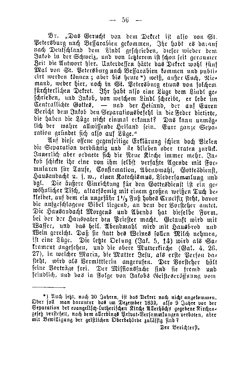 Br. „Das Gerücht von dem Dekret ist also von St. Petersburg und Bessarabien gekommen, Ihr habt es darauf nach Deutschland dem Lindl geschrieben, dieser wieder dem Jakob in der Schweiz, und von letzterem ist schon seit geraumer Zeit die Antwort hier. Unterdessen hätte das Dekret wohl fünf Mal von St. Petersburg nach Bessarabien kommen und publicirt werden können; aber bis heute[1] weiß, außer Euch, Niemand, weder hier, noch in St. Petersburg etwas von solchem fürchterlichen Dekret. Ihr habt also eine Lüge dem Lindl geschrieben, und Jakob, von welchem Lindl schreibt, er lebe im Centrallichte Gottes, — und der Heiland, der auf Euren Bericht dem Jakob den Separationsbefehl in die Feder dictirte, die haben die Lüge nicht einmal erkannt? Das kann unmöglich der wahre allwissende Heiland sein. Eure ganze Separation gründet sich also auf Lüge.“