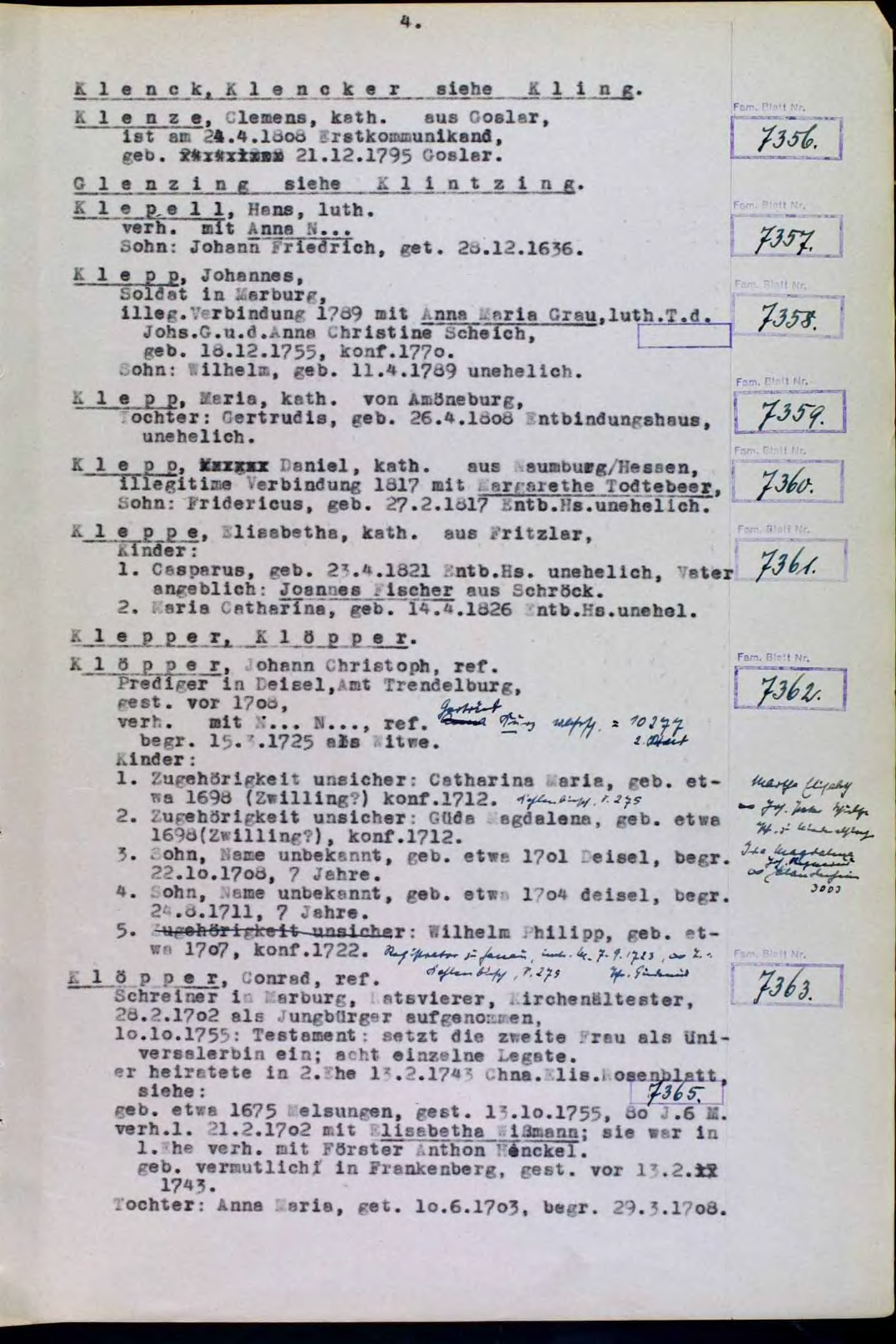 | Seit Fertigstellung des Marburger Sippenbuches 1950-1966 sind zahlreiche Ergänzungen und auch notwendige Korrekturen bekannt geworden. Zur aktuellen Seite existiert noch keine Ergänzunges- und Korrekturseite. Wenn Sie selbst Ergänzungen vornehmen möchten, wenden Sie sich bitte an Benutzer:Ernestus. |