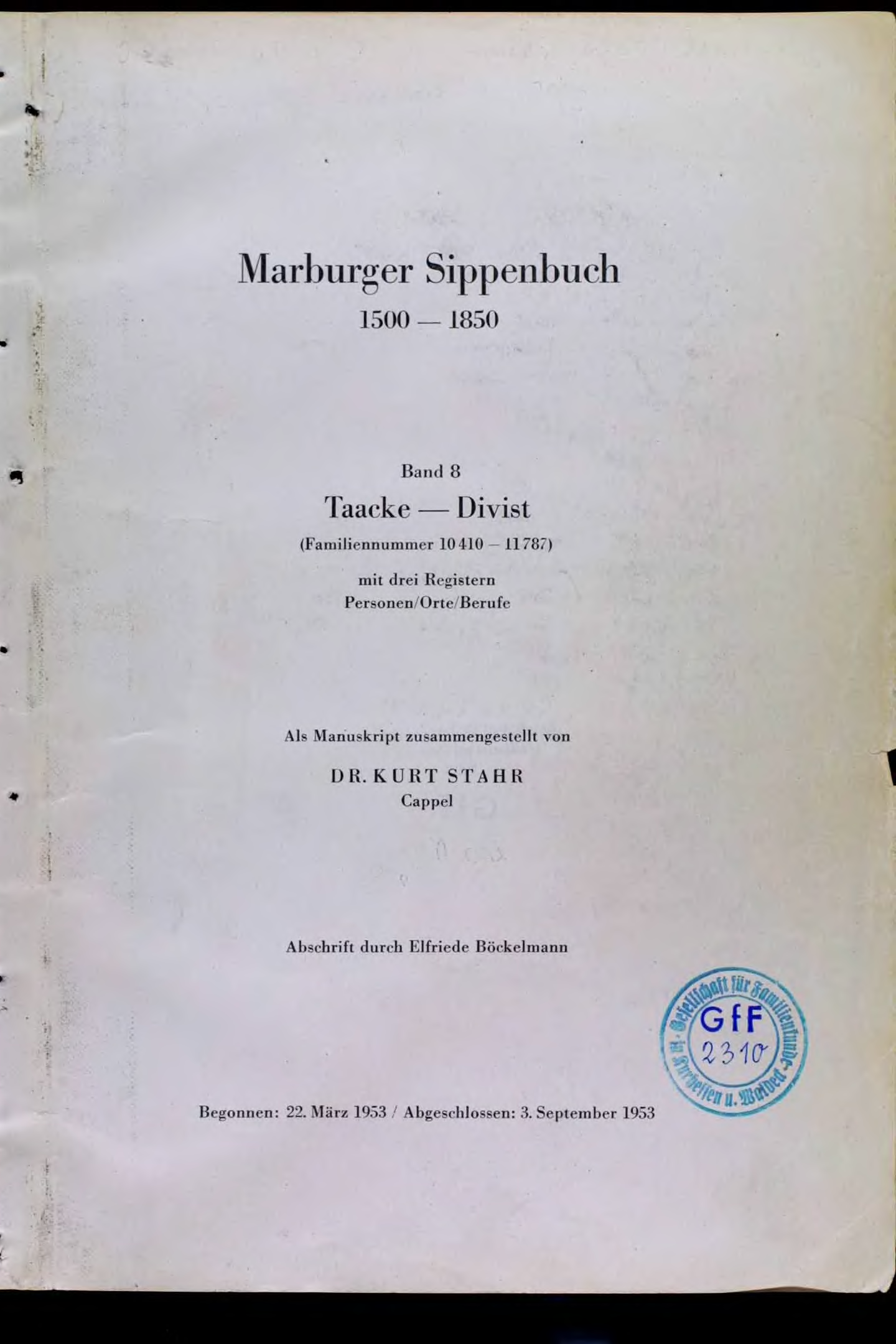 Das Marburger Sippenbuch wird in der Digitalen Bibliothek des Vereins für Computergenealogie e.V. veröffentlicht durch die Gesellschaft für Familienkunde in Kurhessen und Waldeck e.V. (GFKW) mit freundlicher Zustimmung der Erben von Dr. Kurt Stahr. Der Ergänzungsband 1 (Band 24) wird hier veröffentlicht mit freundlicher Zustimmung des Bearbeiters Werner Guth.