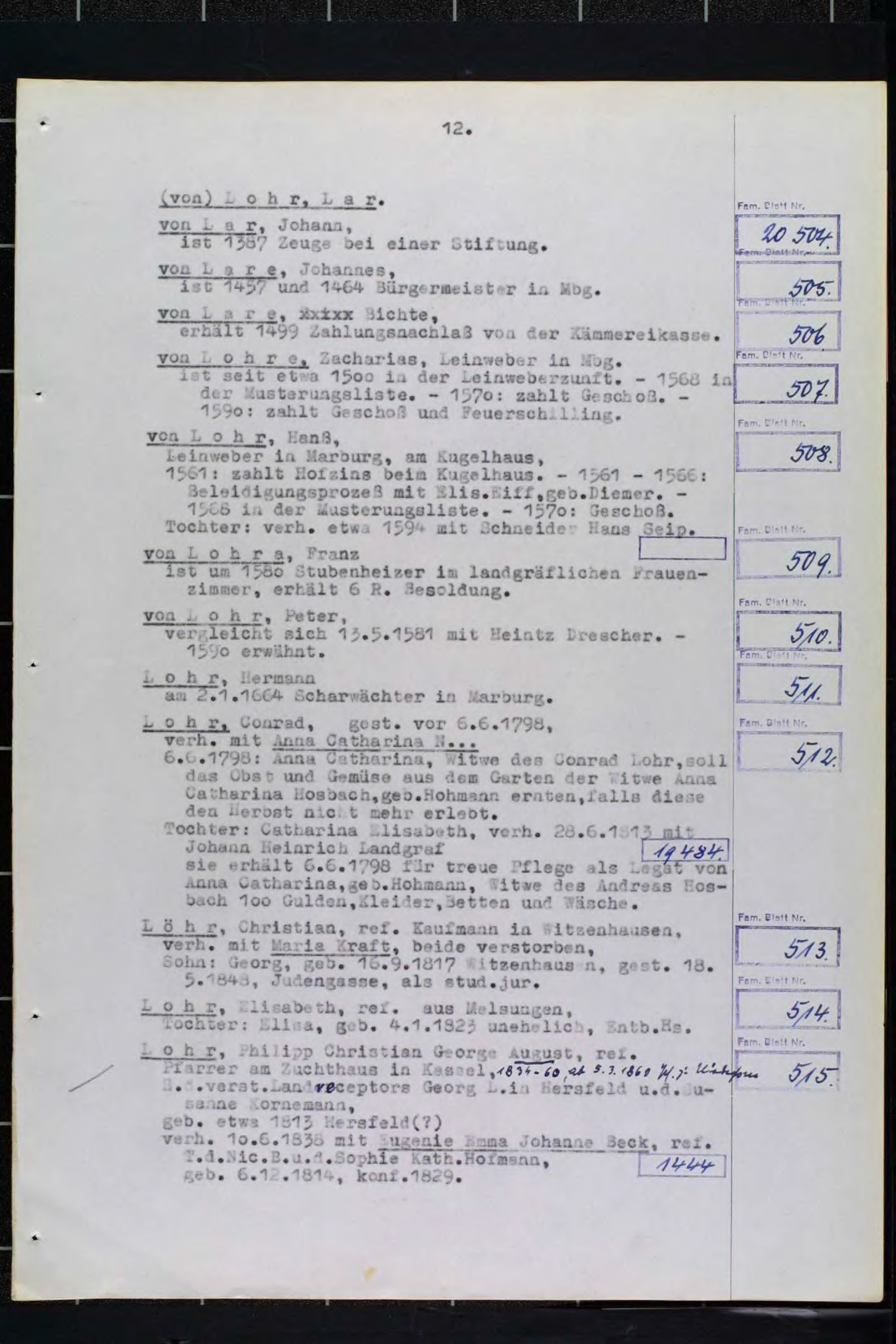 | Seit Fertigstellung des Marburger Sippenbuches 1950-1966 sind zahlreiche Ergänzungen und auch notwendige Korrekturen bekannt geworden. Zur aktuellen Seite existiert noch keine Ergänzunges- und Korrekturseite. Wenn Sie selbst Ergänzungen vornehmen möchten, wenden Sie sich bitte an Benutzer:Ernestus. |