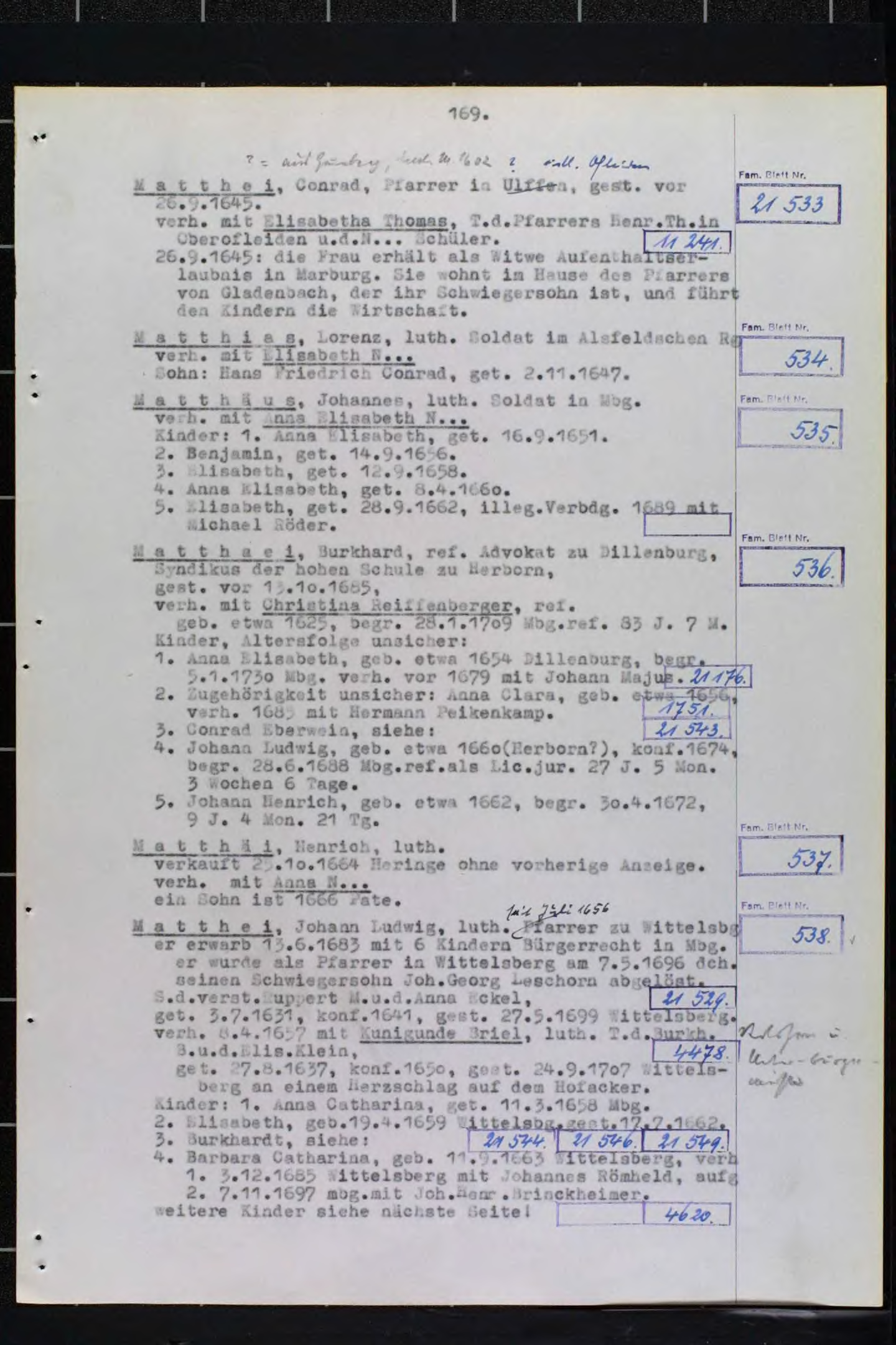 | Seit Fertigstellung des Marburger Sippenbuches 1950-1966 sind zahlreiche Ergänzungen und auch notwendige Korrekturen bekannt geworden. Zur aktuellen Seite existiert noch keine Ergänzunges- und Korrekturseite. Wenn Sie selbst Ergänzungen vornehmen möchten, wenden Sie sich bitte an Benutzer:Ernestus. |