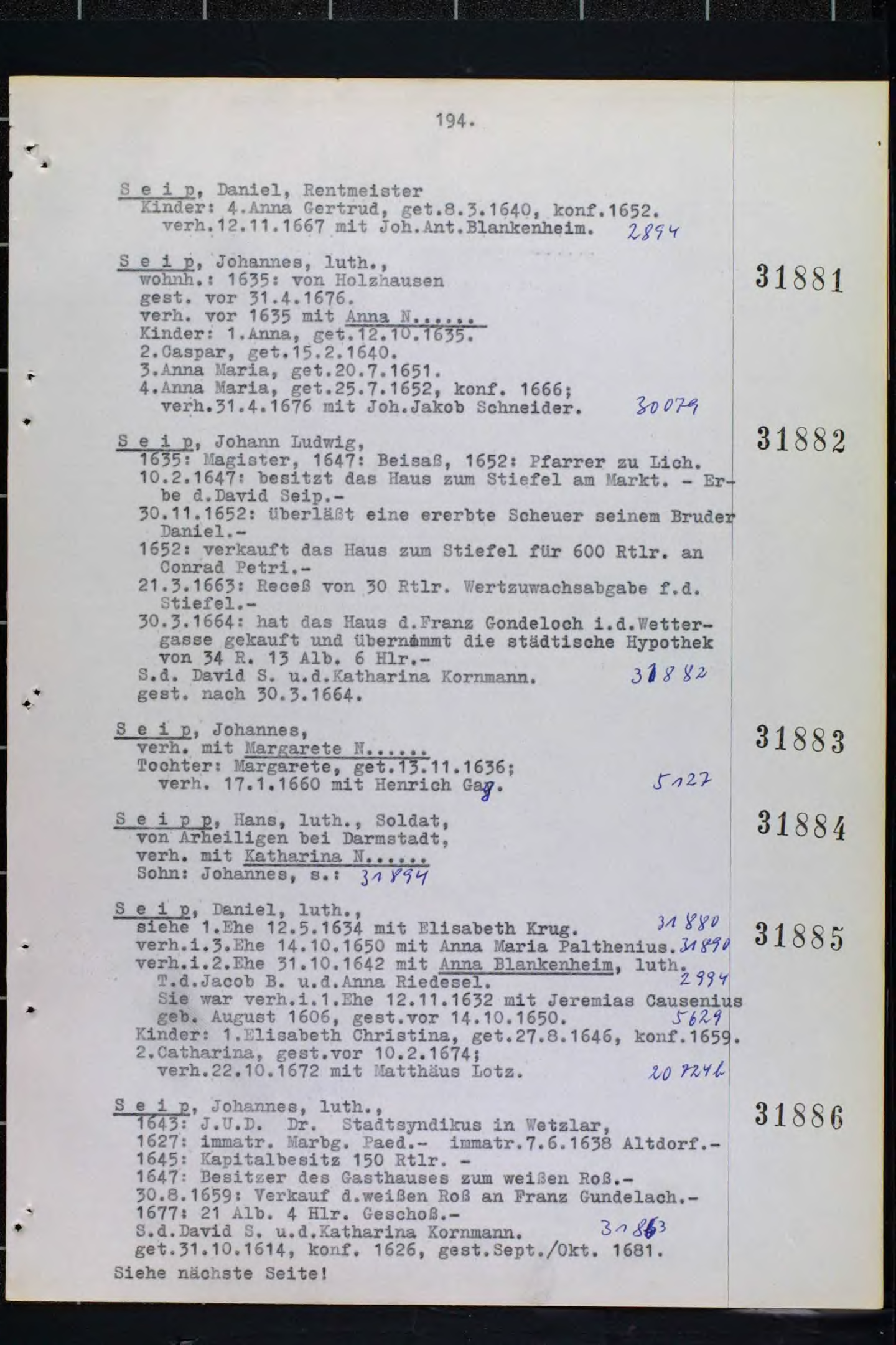 | Seit Fertigstellung des Marburger Sippenbuches 1950-1966 sind zahlreiche Ergänzungen und auch notwendige Korrekturen bekannt geworden. Zur aktuellen Seite existiert noch keine Ergänzunges- und Korrekturseite. Wenn Sie selbst Ergänzungen vornehmen möchten, wenden Sie sich bitte an Benutzer:Ernestus. |