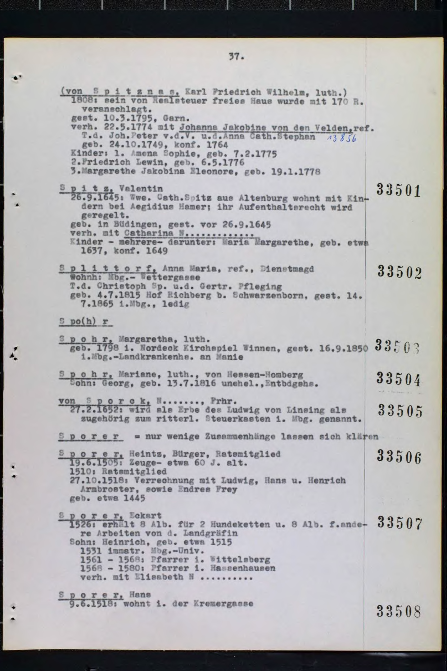 | Seit Fertigstellung des Marburger Sippenbuches 1950-1966 sind zahlreiche Ergänzungen und auch notwendige Korrekturen bekannt geworden. Zur aktuellen Seite existiert noch keine Ergänzunges- und Korrekturseite. Wenn Sie selbst Ergänzungen vornehmen möchten, wenden Sie sich bitte an Benutzer:Ernestus. |