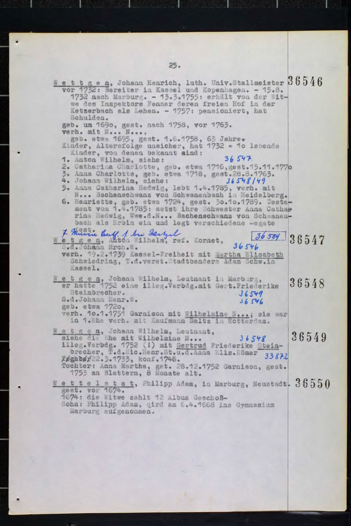 | Seit Fertigstellung des Marburger Sippenbuches 1950-1966 sind zahlreiche Ergänzungen und auch notwendige Korrekturen bekannt geworden. Zur aktuellen Seite existiert noch keine Ergänzunges- und Korrekturseite. Wenn Sie selbst Ergänzungen vornehmen möchten, wenden Sie sich bitte an Benutzer:Ernestus. |