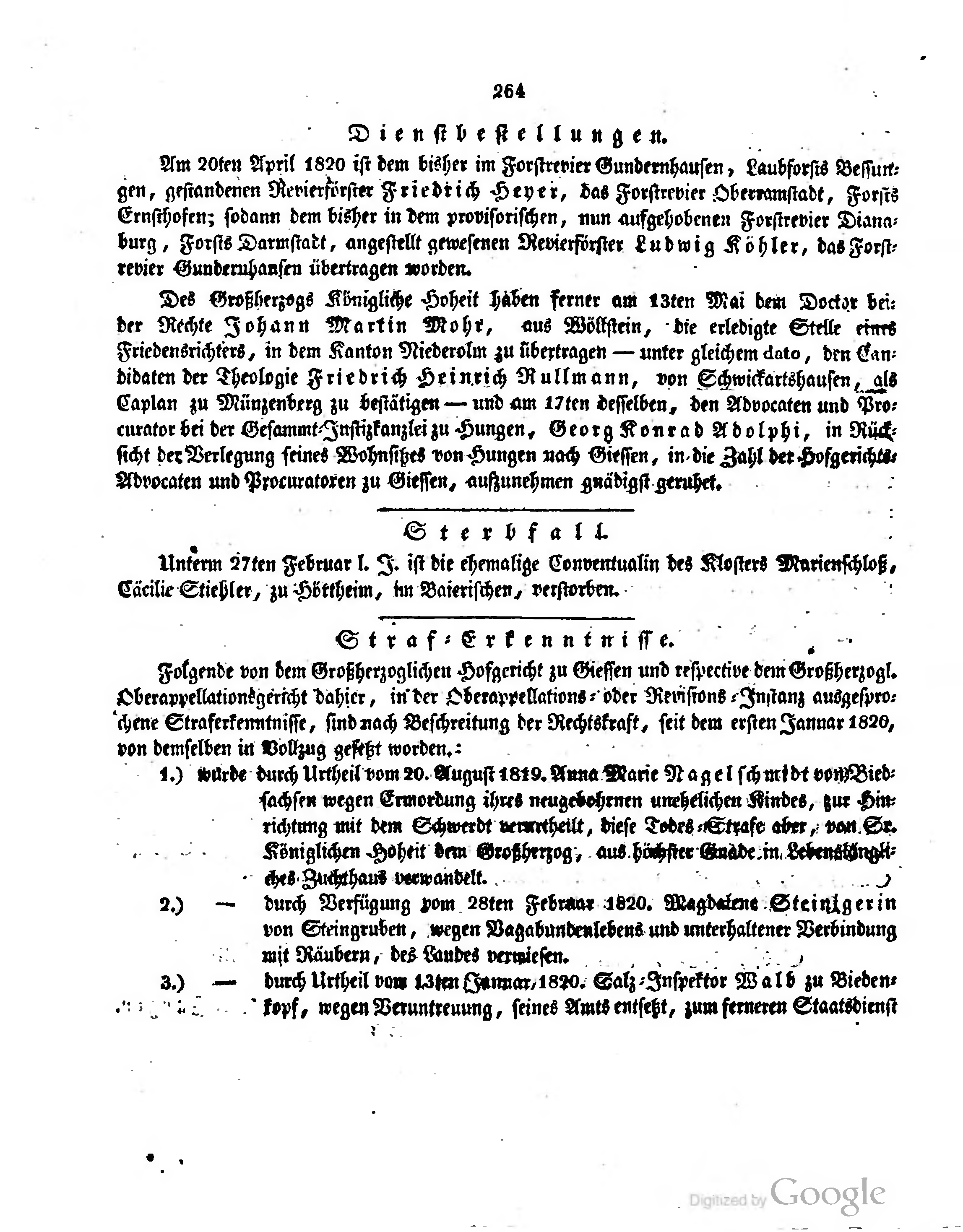 Des Großherzogs Königliche Hoheit haben ferner am 13ten Mai dem Doctor beider Rechte Johann Martin Mohr, aus Wöllstein, die erledigte Stelle eines Friedensrichters, in dem Kanton Niederolm zu übertragen - unter gleichem dato, den Candidaten der Theologie Friedrich Heinrich Rullmann, von Schwickartshausen, als Caplan zu Münzenberg zu bestätigen - und am 17ten desselben, den Advocaten und Procurator bei der Gesammt-Justizkanzlei zu Hungen, Georg Konrad Adolphi, in Rücksicht der Verlegung seines Wohnsitzes von Hungen nach Giessen, in die Zahl der Hofgerichts-Advocaten und Procuratoren zu Giessen, aufzunehmen gnädigst geruhet.