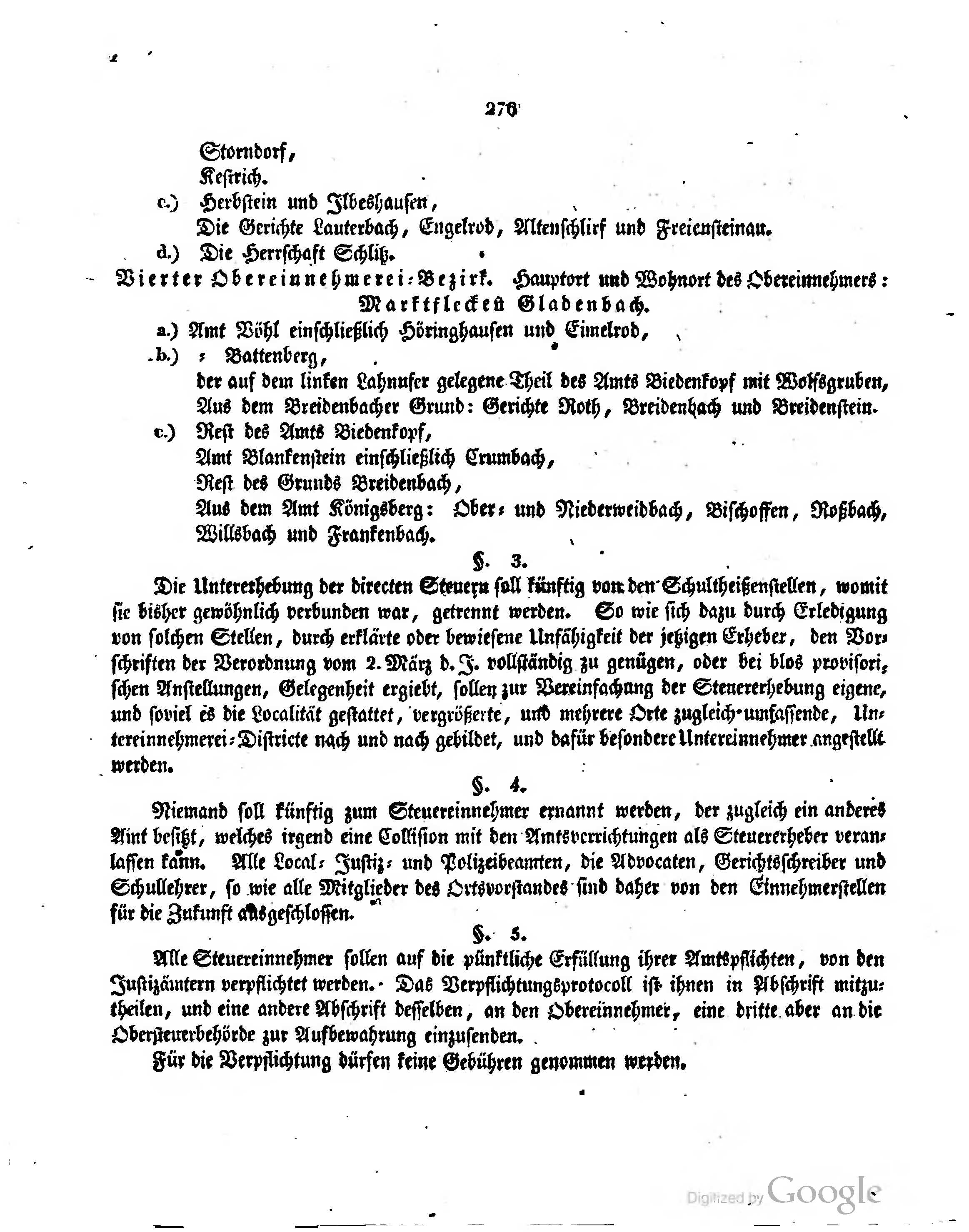 Niemand soll künftig zum Steuereinnehmer ernannt werden, der zugleich ein anderes Amt besitzt, welches irgend eine Collision mit den Amtsverrichtungen als Steuererheber veranlassen kann. Alle Local- Justiz- und Polizeibeamten, die Advocaten, Gerichtsschreiber und Schullehrer, so wie alle Mitglieder des Ortsvorstandes sind daher von den Einnehmerstellen für die Zukunft ausgeschlossen.