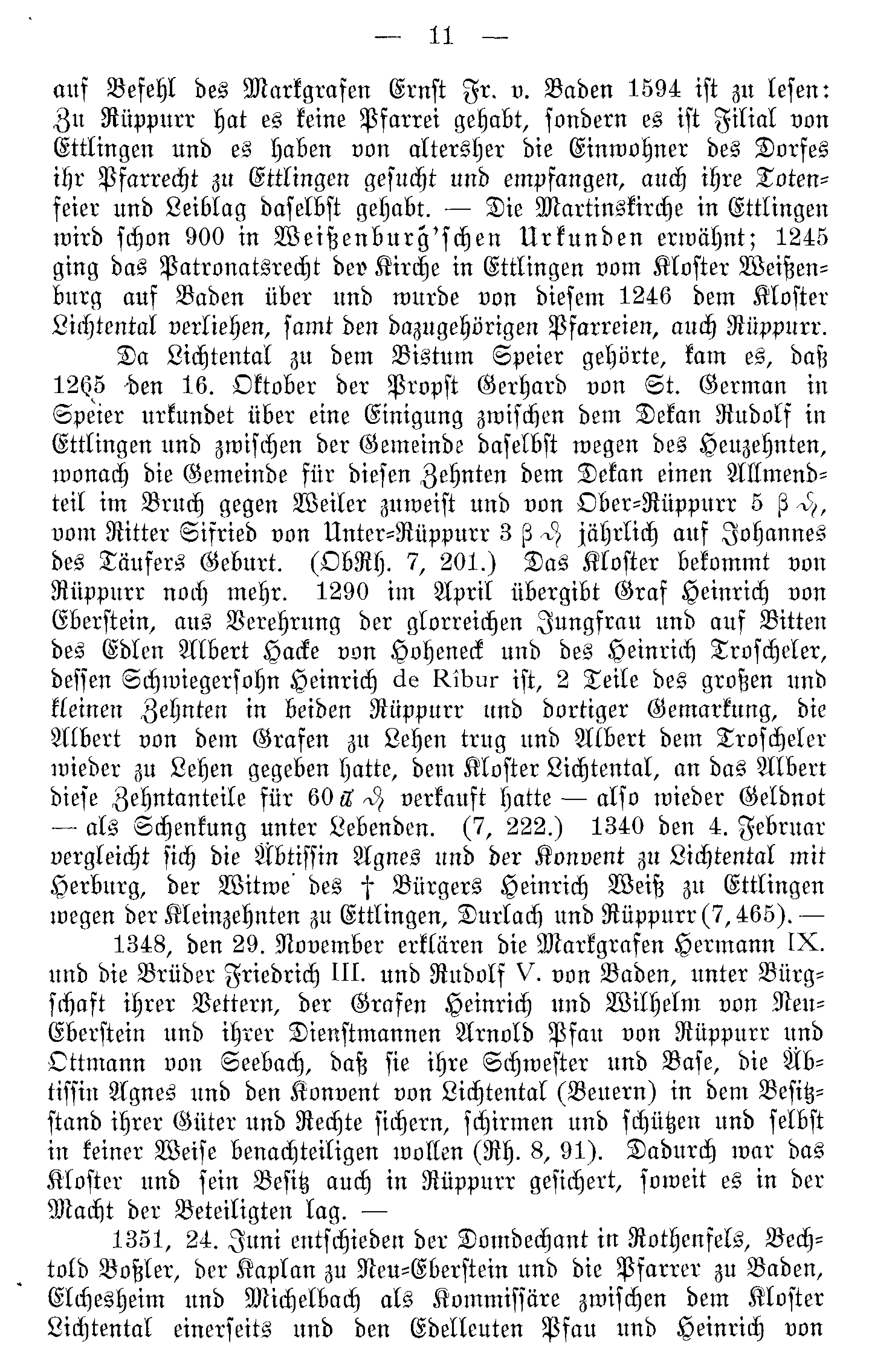 auf Befehl des Markgrafen Ernst Fr. v. Baden 1594 ist zu lesen: Zu Rüppurr hat es keine Pfarrei gehabt, sondern es ist Filial von Ettlingen und es haben von altersher die Einwohner des Dorfes ihr Pfarrecht zu Ettlingen gesucht und empfangen, auch ihre Toten- feier und Leiblag daselbst gehabt. — Die Martinskirche in Ettlingen wird schon 900 in Weißenburg’schen Urkunden erwähnt; 1245v ging das Patronatsrecht der Kirche in Ettlingen vom Kloster Weißen- burg auf Baden über und wurde von diesem 1246 dem Kloster Lichtental verliehen, samt den dazugehörigen Pfarreien, auch Rüppurr.