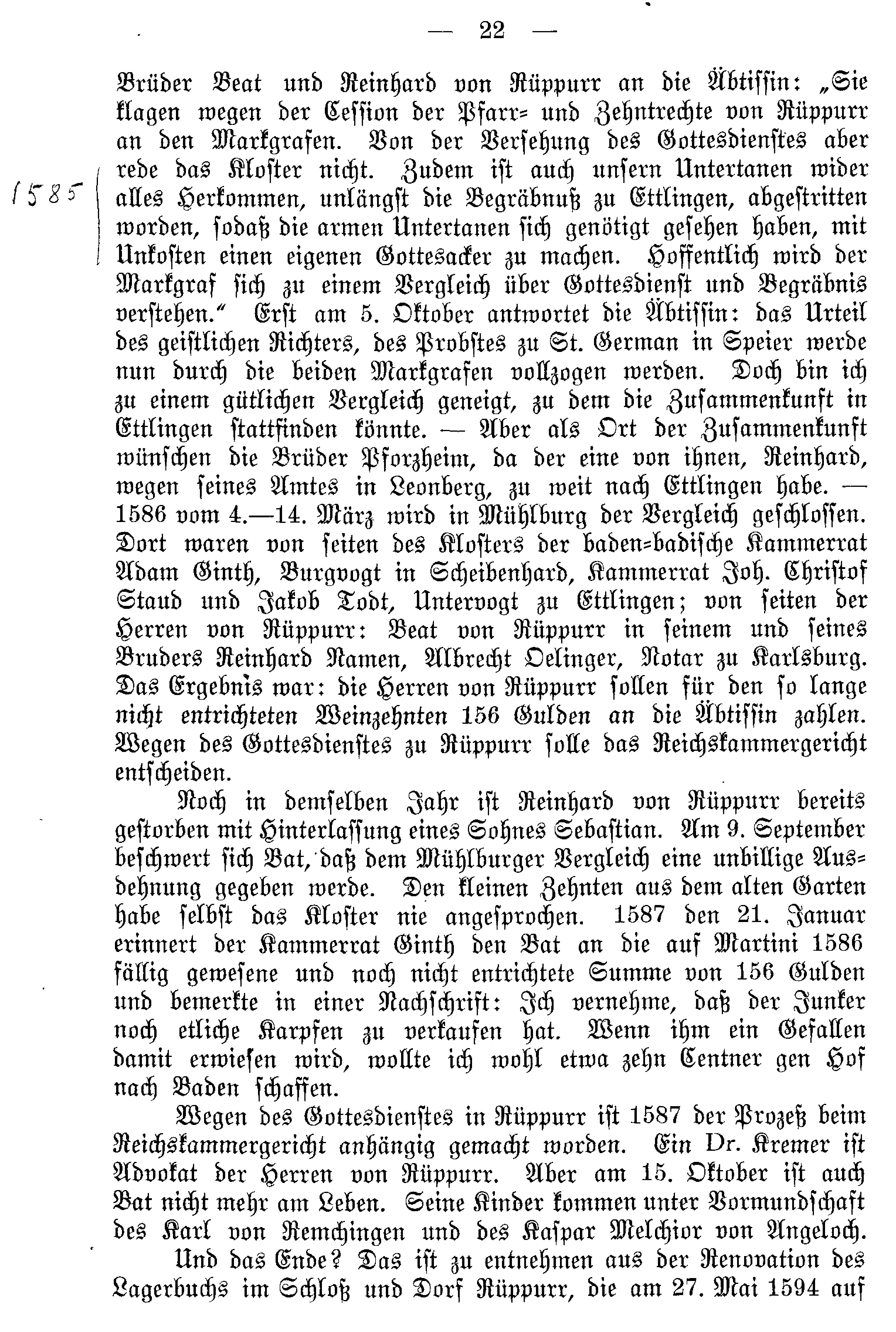 Noch in demselben Jahr ist Reinhard von Rüppurr bereits gestorben mit Hinterlassung eines Sohnes Sebastian. Am 9. September beschwert sich Bat,«daß dem Mühlburger Vergleich eine unbillige Aus- dehnung gegeben werde. Den kleinen Zehnten aus dem alten Garten habe selbst das Kloster nie angesprochen. 1587 den 21. Januar erinnert der Kammerrat Ginth den Bat an die auf Martini 1586 fällig gewesene und noch nicht entrichtete Summe von 156 Gulden und bemerkte in einer Nachschrift: Jch vernehme, daß der Junker noch etliche Karpfen zu verkaufen hat. Wenn ihm ein Gefallen damit erwiesen wird, wollte ich wohl etwa zehn Centner gen Hof nach Baden schaffen.