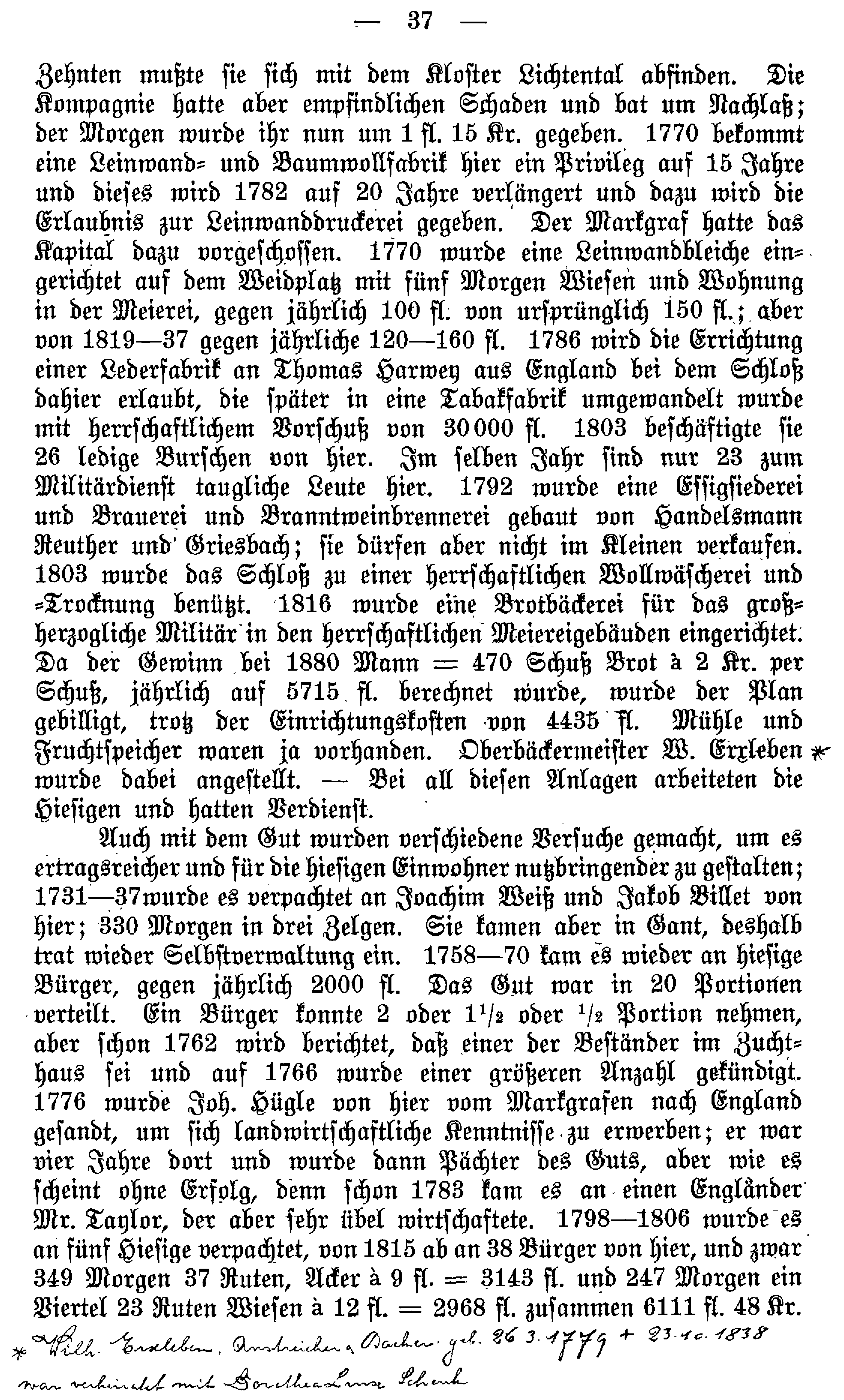 Zehnten mußte sie sich mit dem Kloster Lichtental abfindens Die Kompagnie hatte aber empfindlichen Schaden und bat um Nachlaß; der Morgen wurde ihr nun um 1 fl. 15 Kr. gegeben.f 1770 bekommt eine Leinwand- und Baumwollfabrik hier ein Privileg auf 15 Jahre und dieses wird 1782 auf -20 Jahre verlängert und dazu wird die Erlaubnis zur Leinwanddruckerei gegeben· Der Markgraf hatte das Kapital dazu vorgeschossen. 1770 wurde eineLeinwandbleiche ein-— gerichtet auf dem Weidplatz mit fünf Morgen Wiesen und Wohnung in der Meierei, gegen jährlich f100slx von ursprünglich 150ffls.«;»aber von 1819——37 gegen jährliche 120—-160 fl. 1786 wird die Errichtung einer Lederfabrik an Thomas Harwey aus England bei dem Schloß dahier erlaubt,v die später in seine Tabakfabrik umgewandelt wurde mit herrschaftlichem Vorschuß von«-300«00·fl. 1803 beschäftigte sie 26 ledige Burschen von hier. Jm selben Jahr sind nur 23 zum Militärdienst taugliche Leute hier. 1792 wurde eine Essigsiederei und Brauerei und Branntweinbrennerei gebaut von Handelsmann Reuther und« Griesbach; sie dürfen aber nicht im Kleinen verkaufen; 1803 wurde das Schloß zu einer herrschaftlichen Wollwäscherei und -«Trocknung benützt. «1816, wurde eineBrotbäckerei für das groß- herzogliche Militärin den herrschaftlichen Meiereigebäuden eingerichtet; Da der Gewinn bei 1880«Mann = 470 Schuß Brot ä 2 Kr. per Schuß, jährlich auf 5715zfl. berechnet wurde, wurde der Plan gebilligt, trotz der Einrichtungskosten von 4435·Tl. Mühle und Fruchtspeicher waren ja vorhanden· Oberbäckermeister W. Erxleben ye- "wurde" dabei angestellt — Bei all diesen Anlagen arbeiteten die Hiesigen und hatten Verdienst. » «