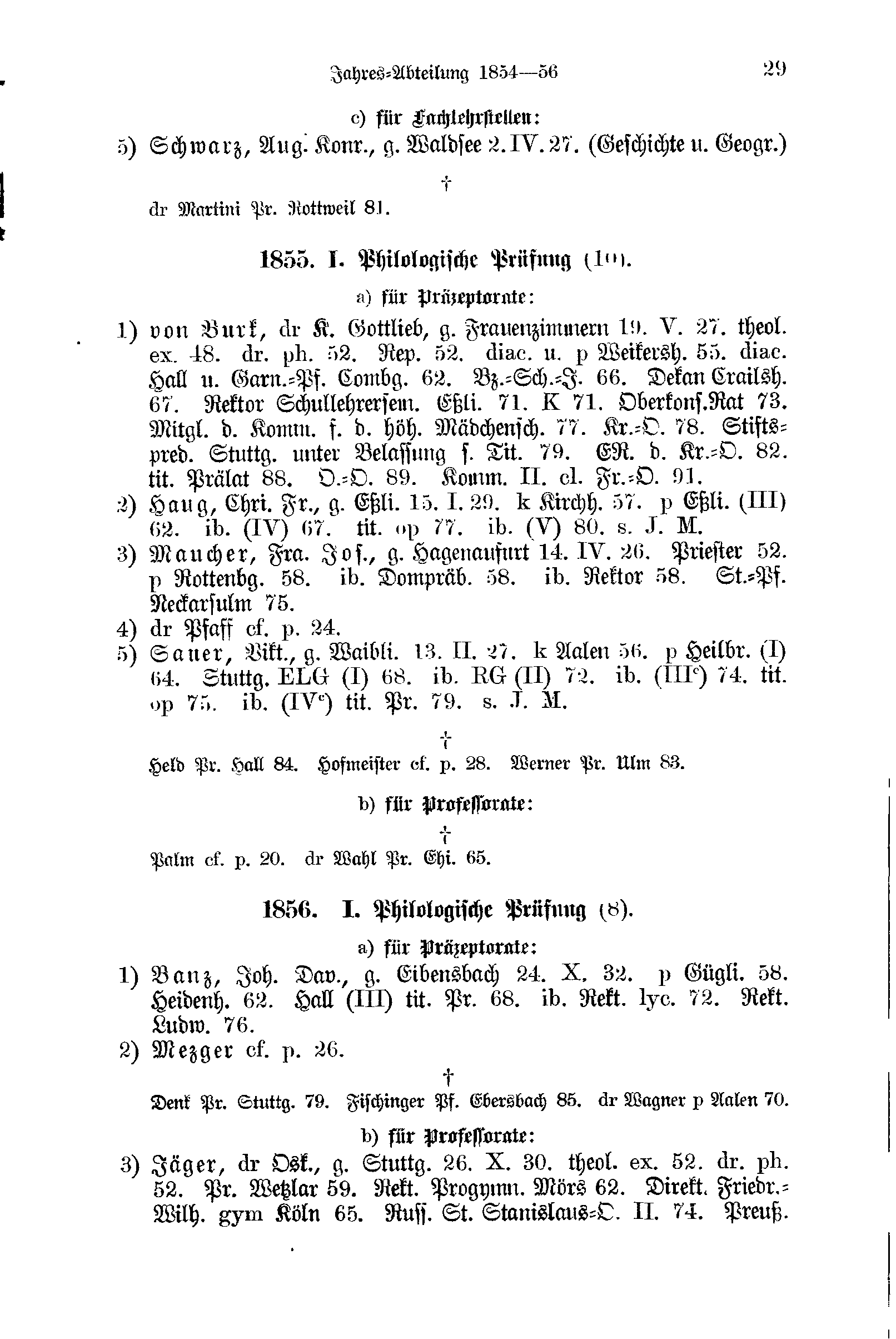 - Jäger dr Osk., g. Stuttg. 26. X. 30. theol. ex. 52. dr. ph. 52. Pr. Wetzlar 59. Rekt. Progymn. Mörs 62. Direkt. Friedr.-Wilh. gym Köln 65. Russ. St. Stanislaus-O. II. 74. Preuß.