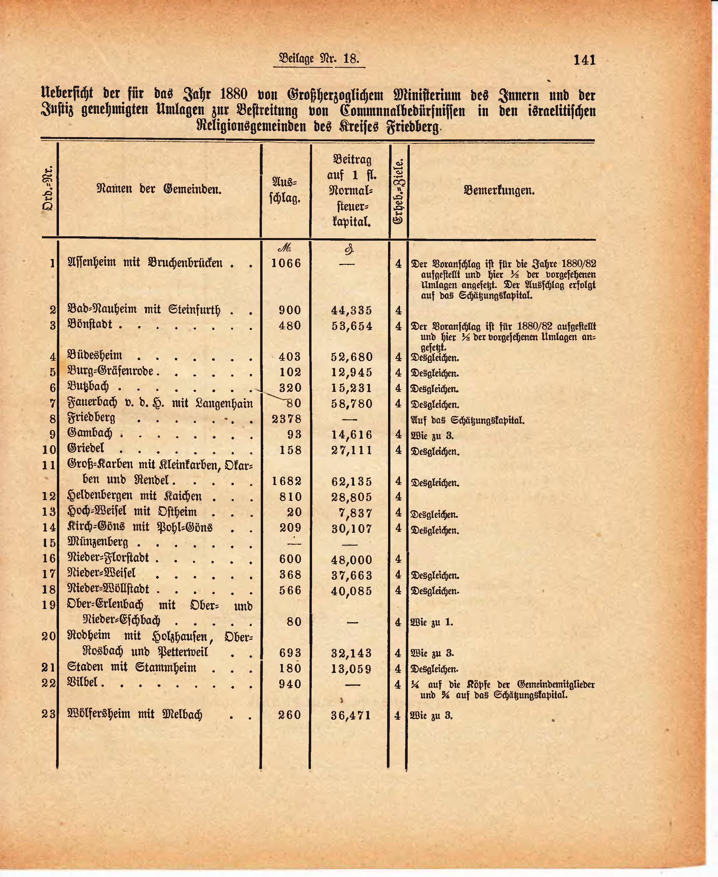 Uebersicht der für das Jahr 1880 von Großherzoglichem Ministerium des Innern und der Justiz genehmigten Umlagen zur Bestreitung von Communalbedürfnissen in den israelitischen Religionsgemeinden des Kreises Friedberg.