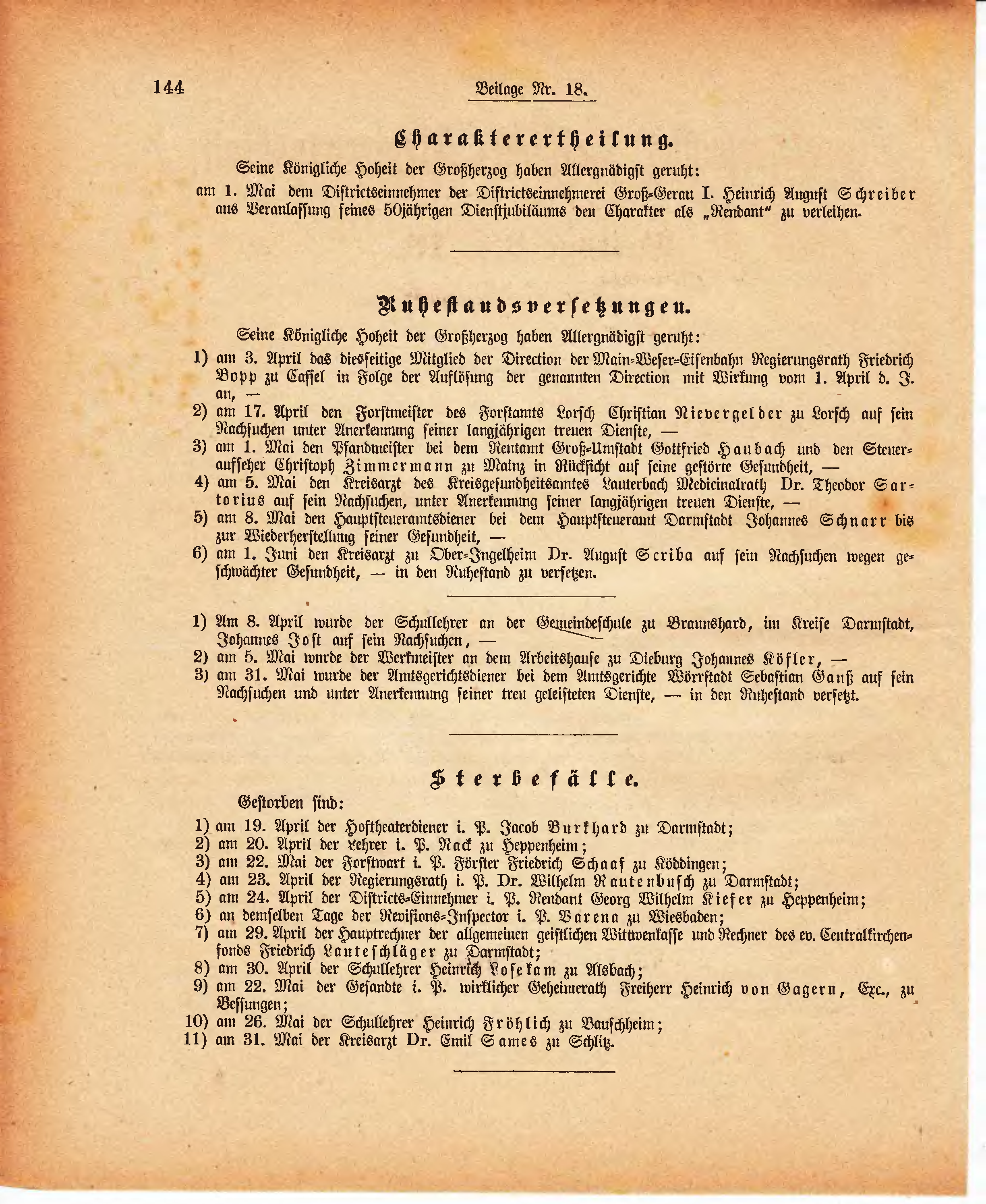 | 6) | am 1. Juni den Kreisarzt zu Ober-Ingelheim Dr. August Scriba auf sein Nachsuchen wegen geschwächter Gesundheit, - in den Ruhestand zu versetzen. |