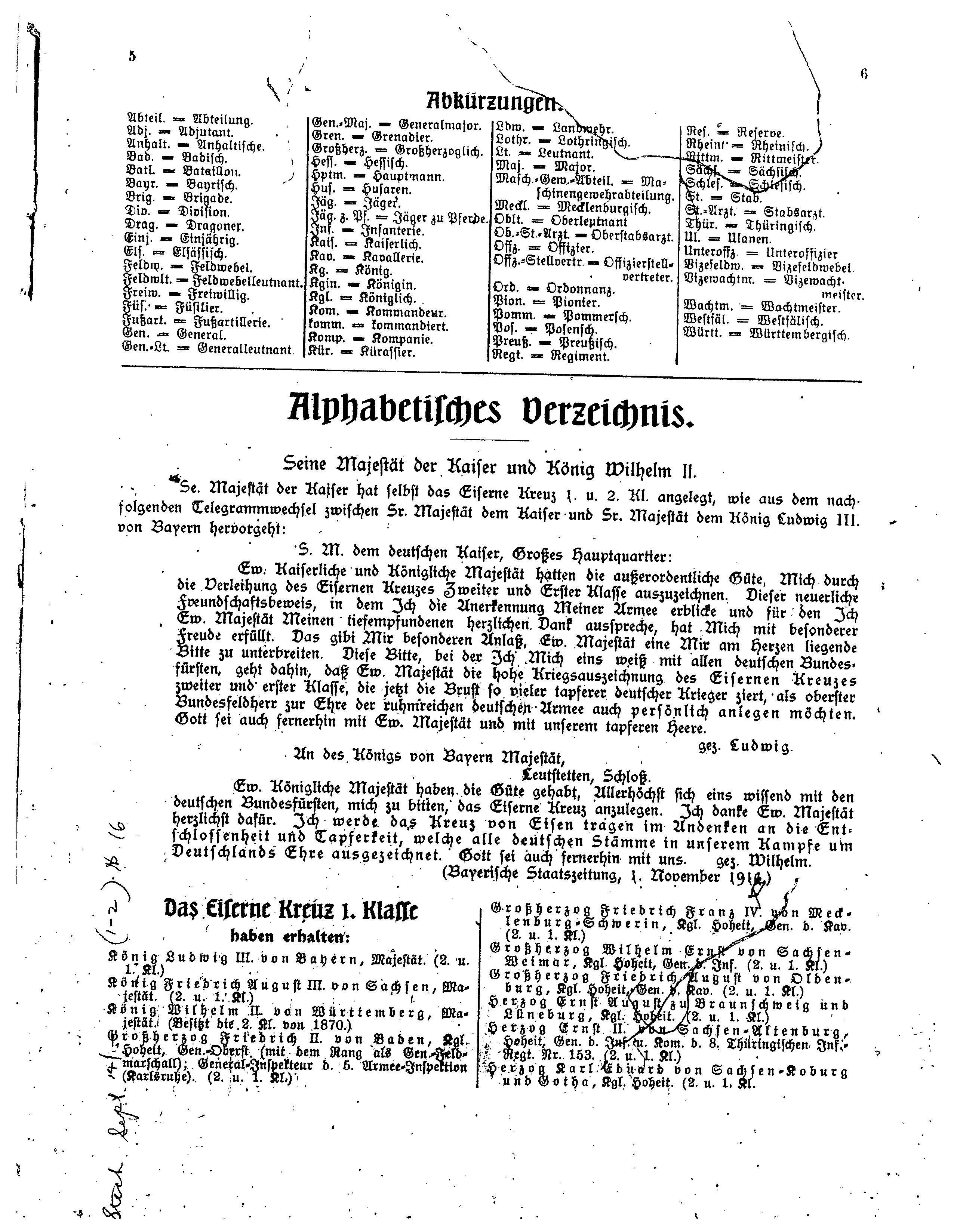 | Se. Majestät der Kaiser hat selbst da Eiserne Kreuz 1. und2. Kl. angelegt, wie aud dem nachfolgenden Telegrammwechsel zwischen Sr. Majestät dem Kaiser und Sr. Majestät dem König Ludwig III von Bayern hervorgeht: