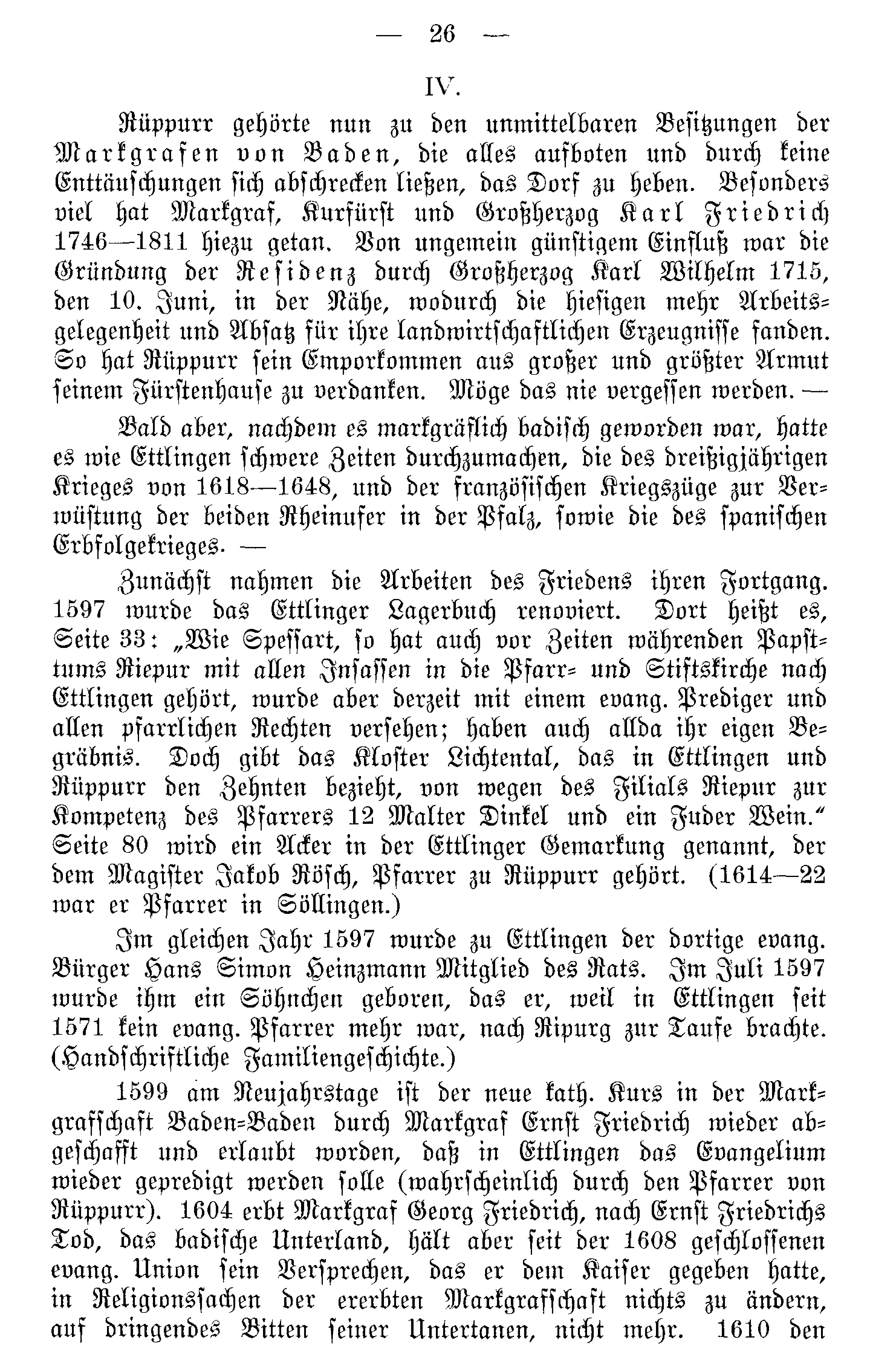 Im gleichen Jahr 1597 wurde zu Ettlingen der dortige evang. Bürger Hans Simon Heinzmann Mitglied des Rats. Im Juli 1597 wurde ihm ein Söhnchen geboren, das er, weil in Ettlingen seit 1571 kein evang. Pfarrer mehr war, nach Ripurg zur Taufe brachte. (Handschriftliche Familiengeschichte.)
