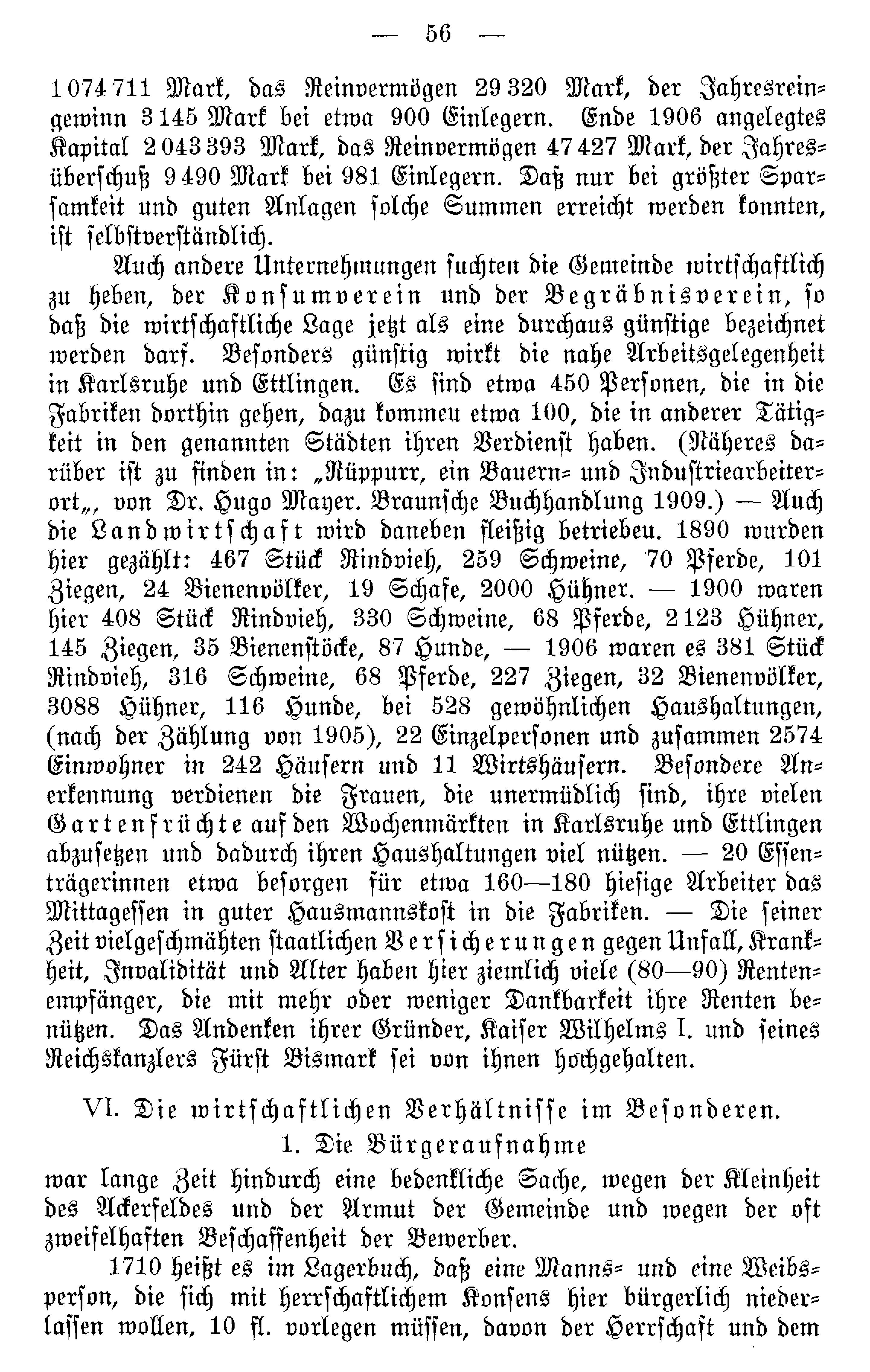 Auch andere Unternehmungen suchten die Gemeinde wirtschaftlich zu heben, der Konsumverein und der Begräbnisverein, so daß die wirtschaftliche Lage jetzt als eine durchaus günstige bezeichnet werden darf. Besonders günstig wirkt die nahe Arbeitsgelegenheit in Karlsruhe und Ettlingen. Es sind etwa 450 Personen, die in die Fabriken dorthin gehen, dazu kommen etwa 100, die in anderer Tätigkeit in den genannten Städten ihren Verdienst haben. (Näheres darüber ist zu finden in: „Rüppurr, ein Bauern- und Industriearbeiterort”, von Dr. Hugo Mayer. Braunsche Buchhandlung 1909.) –- Auch die Landwirtschaft wird daneben fleißig betrieben. 1890 wurden hier gezählt: 467 Stück Rindvieh, 259 Schweine, 70 Pferde, 101 Ziegen, 24 Bienenvölker, 19 Schafe, 2000 Hühner. – 1900 waren hier 408 Stück Rindvieh, 330 Schweine, 68 Pferde, 2128 Hühner, 145 Ziegen, 35 Bienenstöcke, 87 Hunde, –- 1906 waren es 381 Stück Rindvieh, 316 Schweine, 68 Pferde, 227 Ziegen, 32 Bienenvölker, 3088 Hühner, 116 Hunde, bei 528 gewöhnlichen Haushaltungen, (nach der Zählung von 1905), 22 Einzelpersonen und zusammen 2574 Einwohner in 242 Häusern und 11 Wirtshäusern. Besondere Anerkennung verdienen die Frauen, die unermüdlich sind, ihre vielen Gartenfrüchte auf den Wochenmärkten in Karlsruhe und Ettlingen abzusetzen und dadurch ihren Haushaltungen viel nützen. – 20 Essenträgerinnen etwa besorgen für etwa 160–180 hiesige Arbeiter das Mittagessen in guter Hausmannskost in die Fabriken. – Die seiner Zeit vielgeschmähten staatlichen Versicherungen gegen Unfall, Krankheit, Invalidität und Alter haben hier ziemlich viele (80–90) Rentenempfänger, die mit mehr oder weniger Dankbarkeit ihre Renten benützen. Das Andenken ihrer Gründer, Kaiser Wilhelms I. und seines Reichskanzlers Fürst Bismark sei von ihnen hochgehalten.