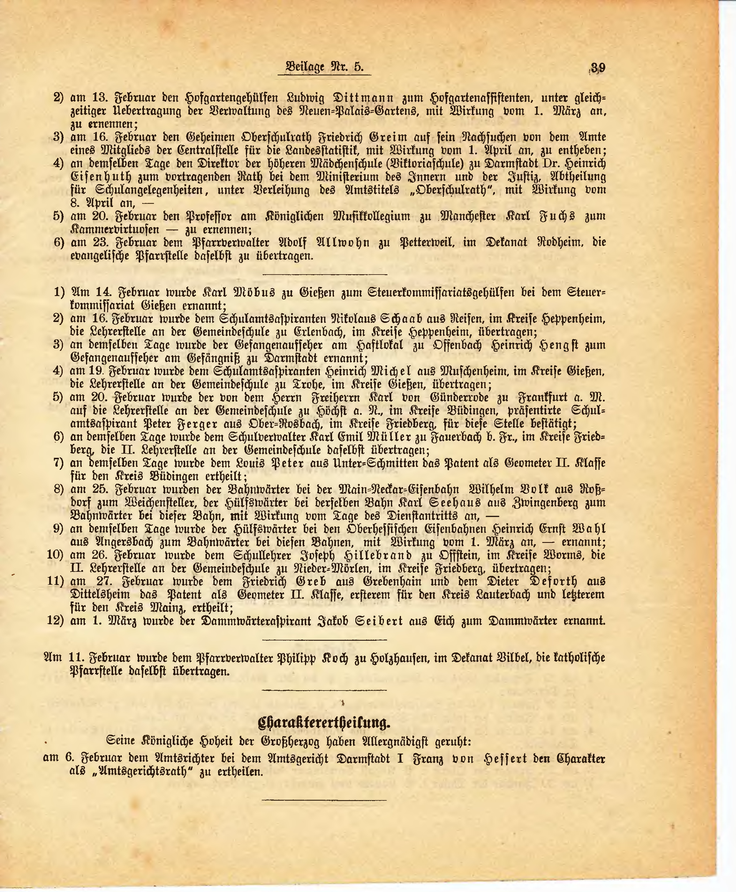 | 1) | Am 14. Februar wurde Karl Möbus zu Gießen zum Steuerkommissariatsgehülfen bei dem Steuerkommissariat Gießen ernannt; |