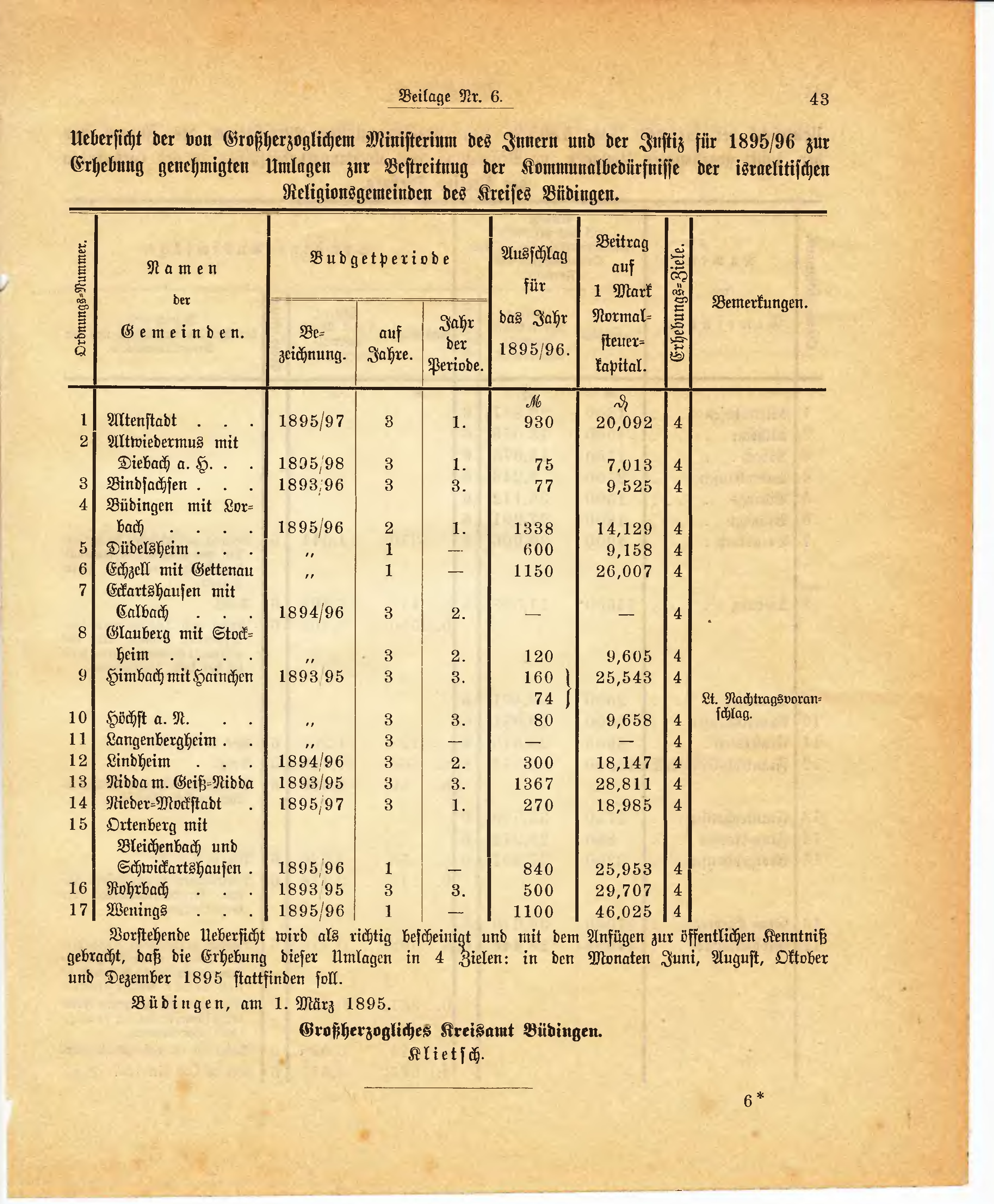 Uebersicht der von Großherzoglichem Ministerium des Innern und der Justiz für 1895/96 zur Erhebung genehmigten Umlagen zur Bestreitung der Kommunalbedürfnisse der israelitischen Religionsgemeinden des Kreises Büdingen.