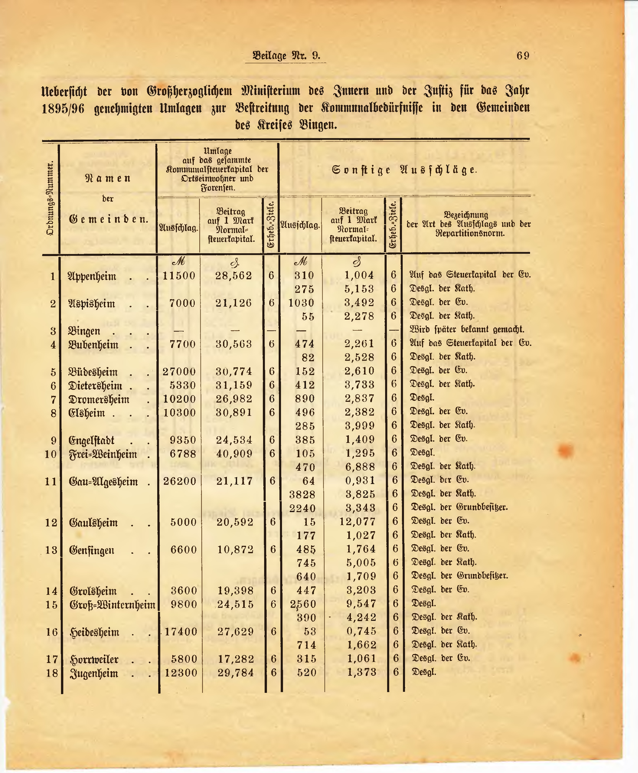 Uebersicht der von Großherzoglichem Ministerium des Innern und der Justiz für das Jahr 1895/96 genehmigten Umlagen zur Bestreitung der Kommunalbedürfnisse in den Gemeinden des Kreises Bingen..