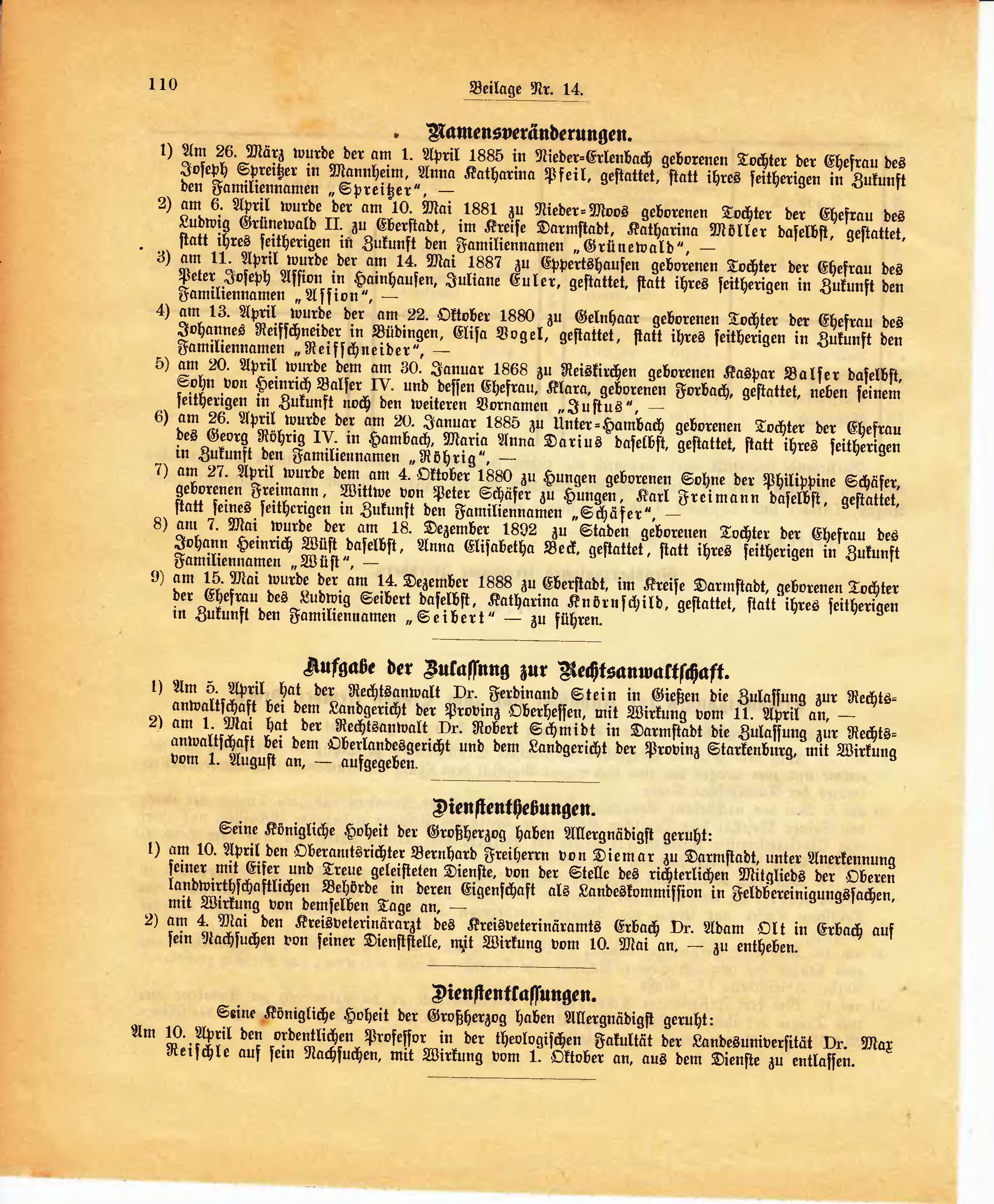 9) am 15. Mai wurde der am 14. Dezember 1888 zu Eberstadt, im Kreise Darmstadt, geborenen Tochter der Ehefrau des Ludwig Seibert daselbst, Katharina Knörnschild, gestattet, statt ihres seitherigen in Zukunft den Familiennamen "Seibert" - zu führen.